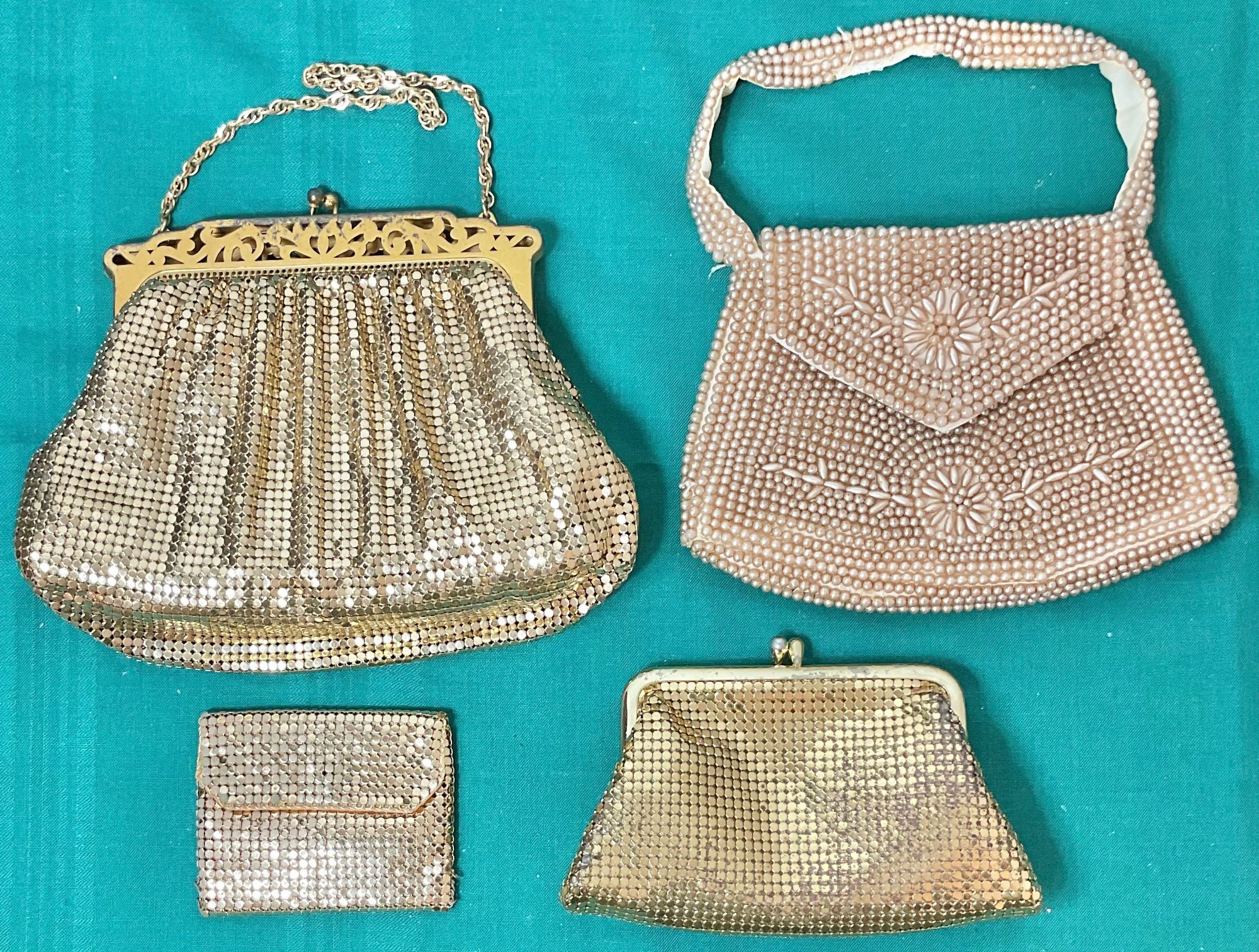Vintage Purses - gold mesh Whiting Davis - heavy faux pearl - good used condition