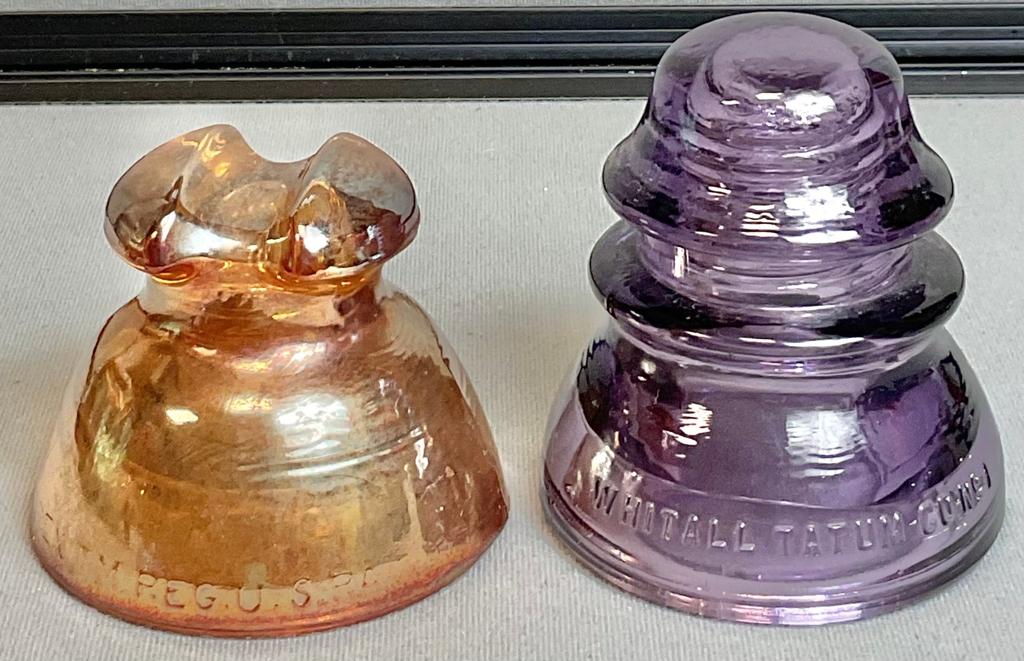 Vintage Pyrex Carnival Glass & Whitall Tatum Purple Glass - Insulators - carnival glass 3.25” tall - purple glass 4.25” tall - no chips - good used condition