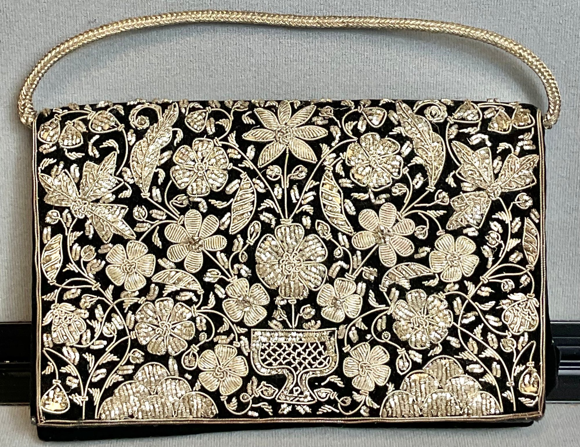 Vintage Silver Bullion Embroidered Indian Zardozi Purse - 5” tall x 8” long x 1.5” wide - good used condition