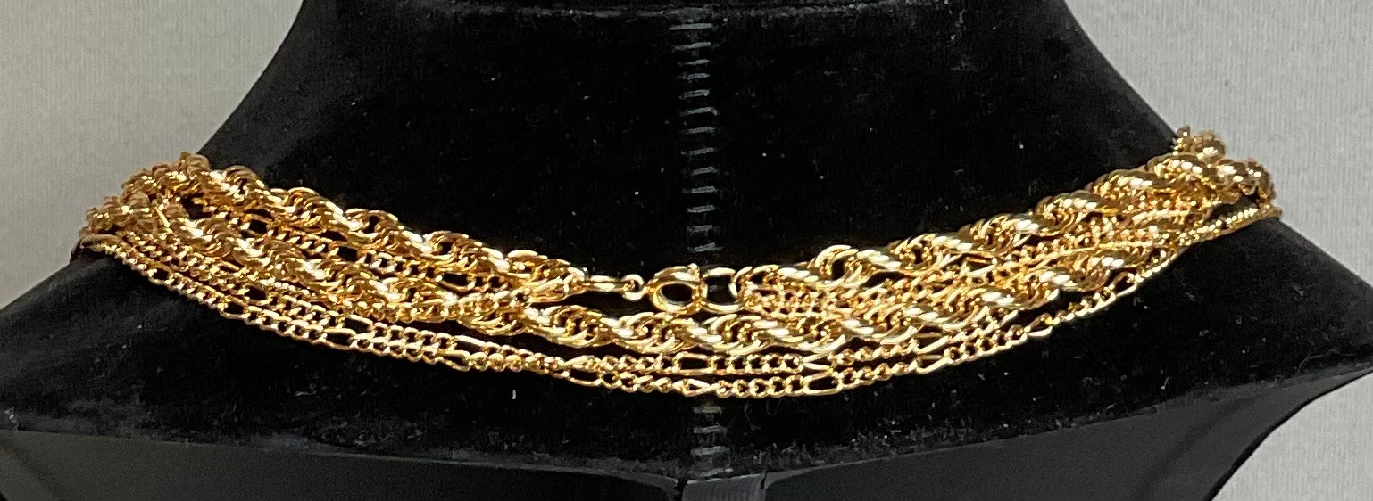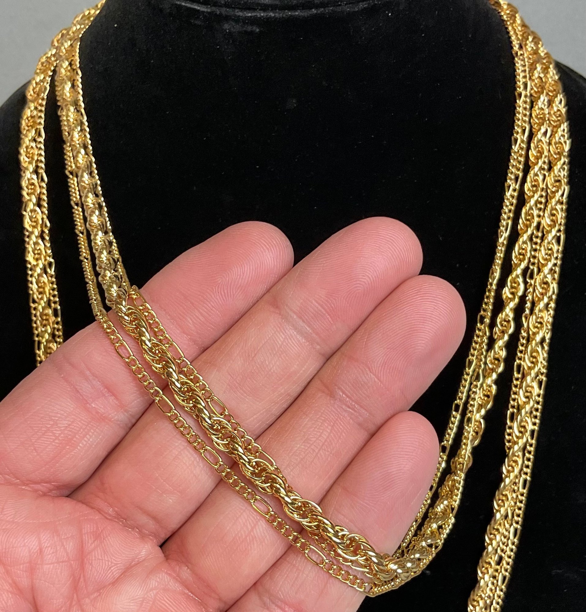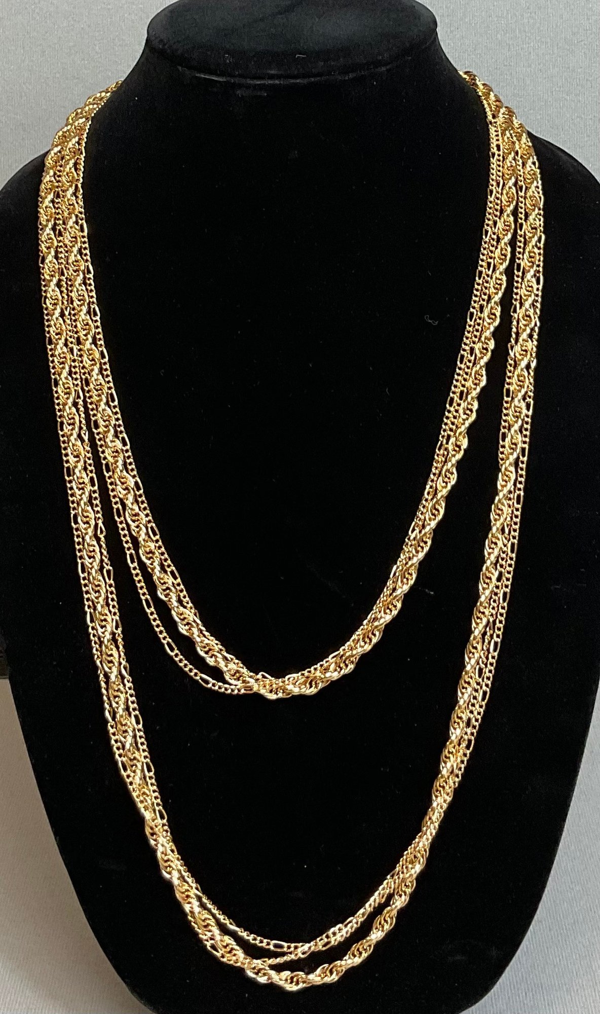 Vintage Three Strand Gold Tone Necklace - unmarked - rope & Figaro link - 52” long - good used condition