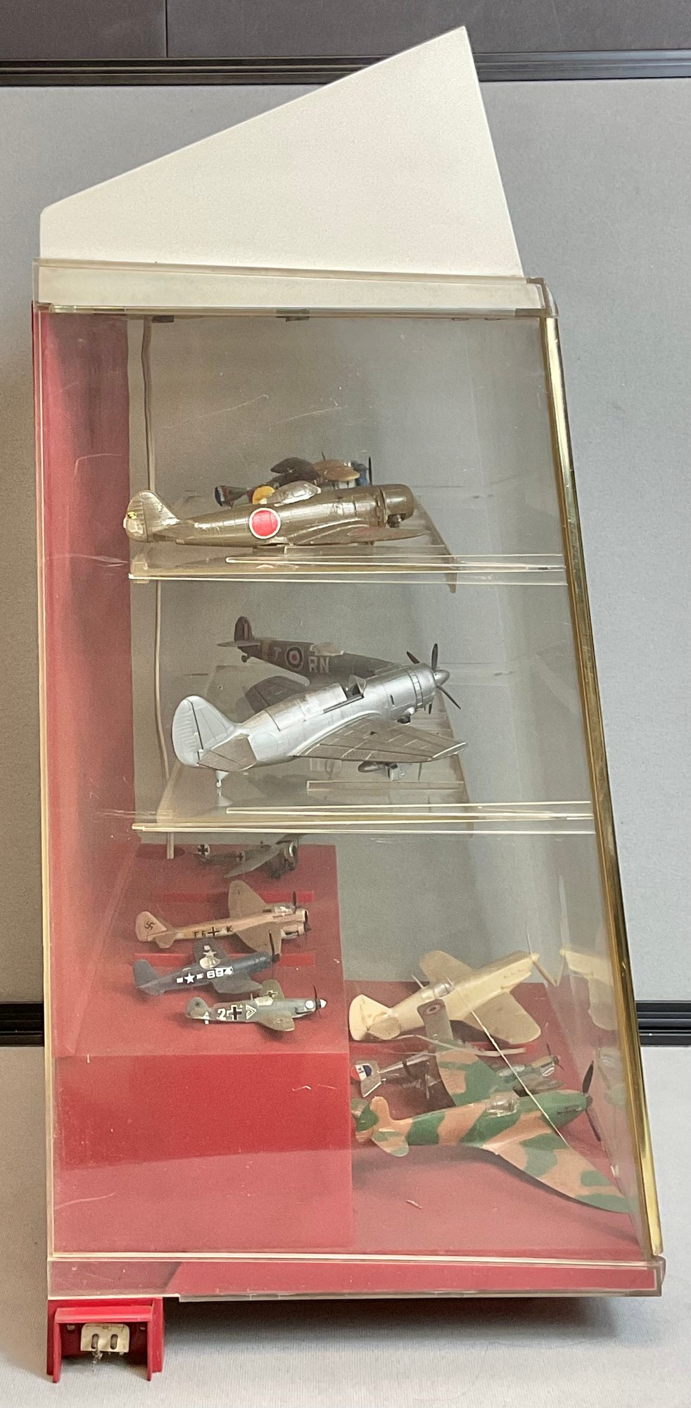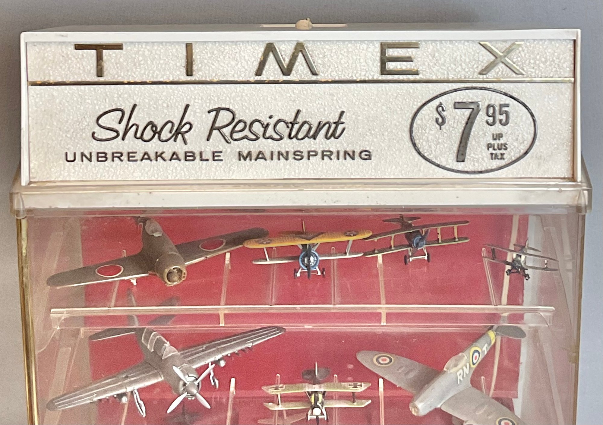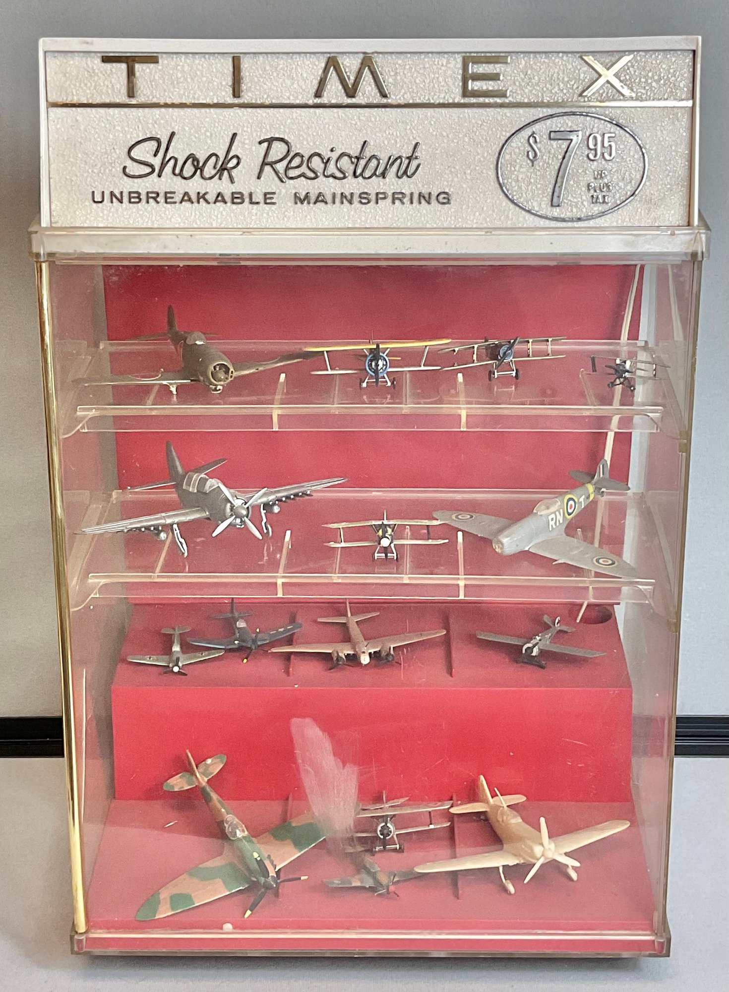 Vintage Timex Watch Store Display W/ Model Airplane Collection - 21.5” tall x 14” long x 10” wide - has scuffs and crack on side - still displays nicely - good used condition