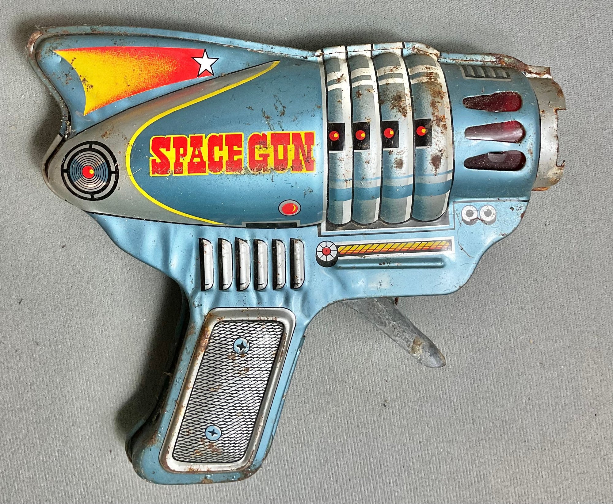 Vintage Tin Litho Space Gun - Japan - as found - missing red plastic end - mechanism works - 6.5” long x 5.5” tall - good used condition