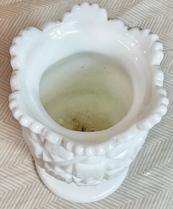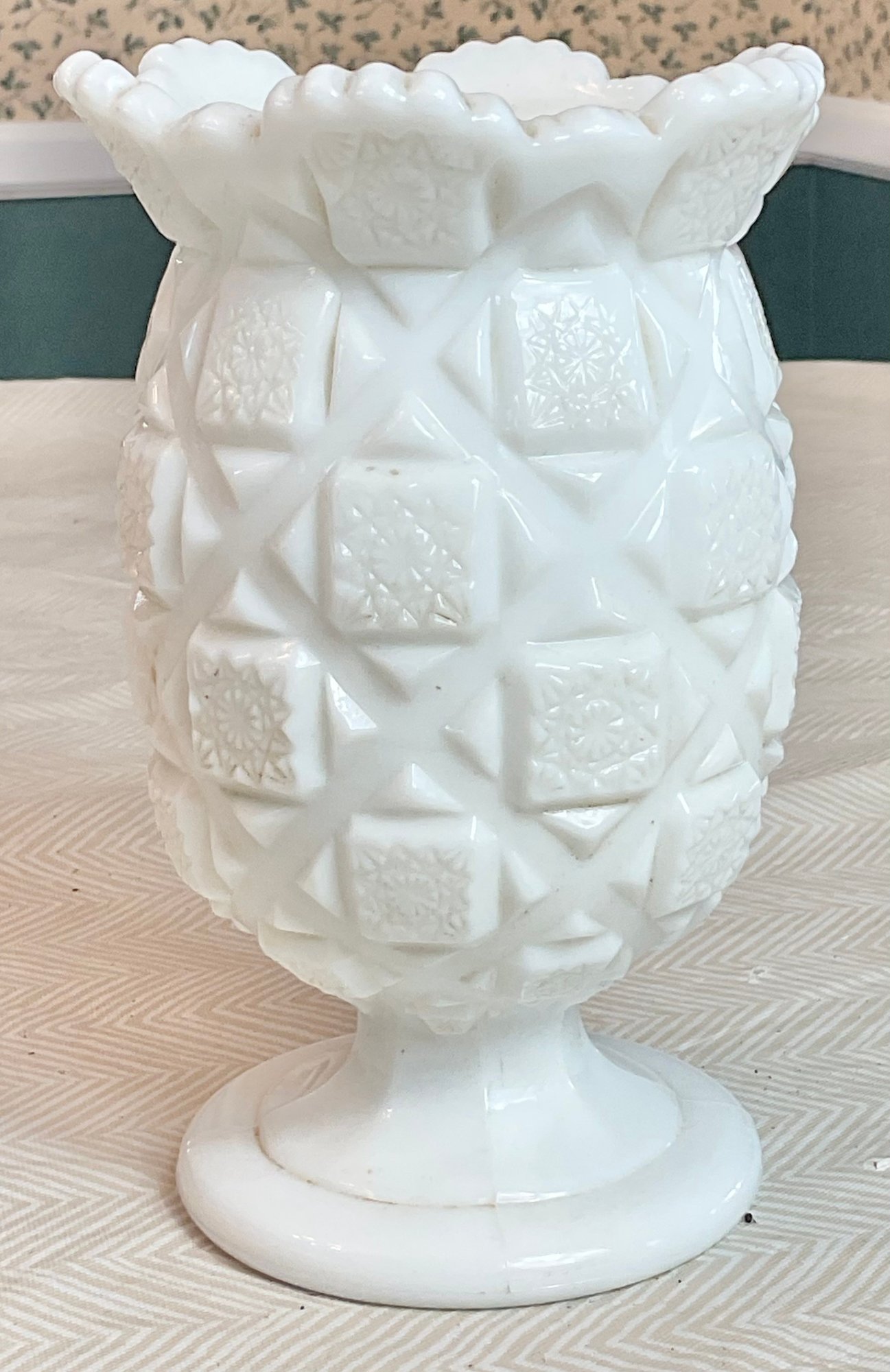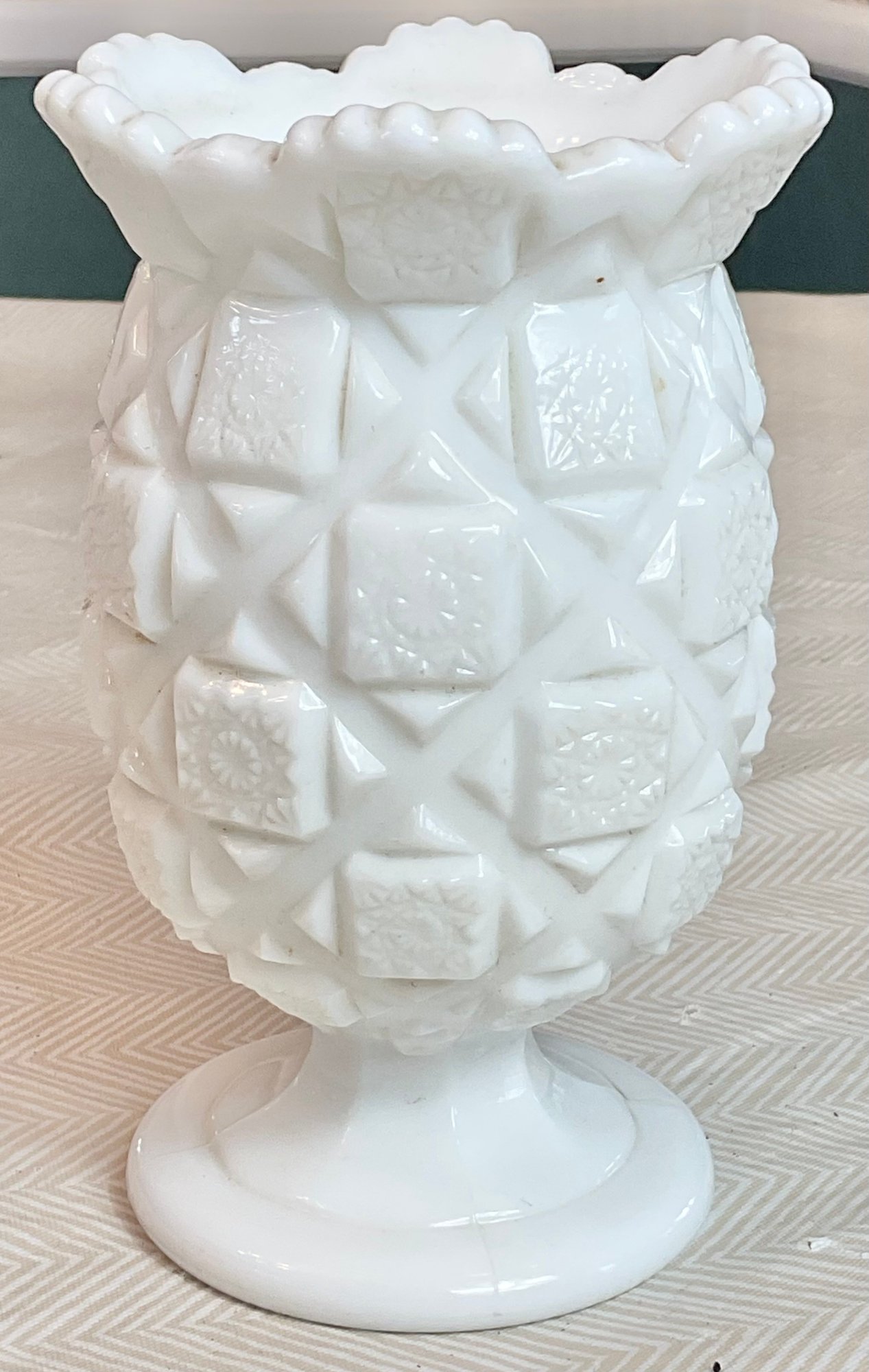 Westmoreland Milk Glass Old Quilt Pattern Vase - no chips - 6.5” tall - 4 3/8” wide - good used condition