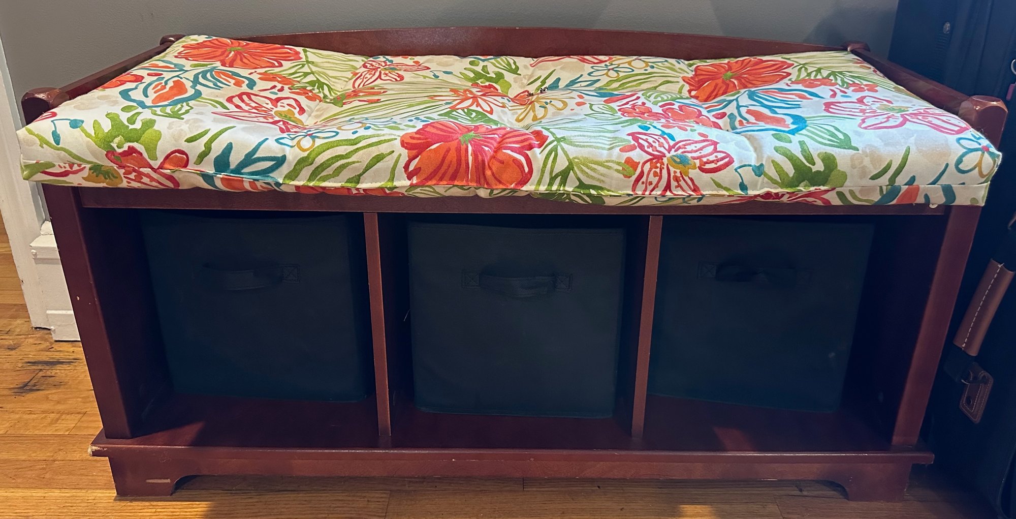 Wood Bench With 3 Basket Storage - 40 3/4'' x 15 1/2'' x 21'' - small chips shown - good used condition