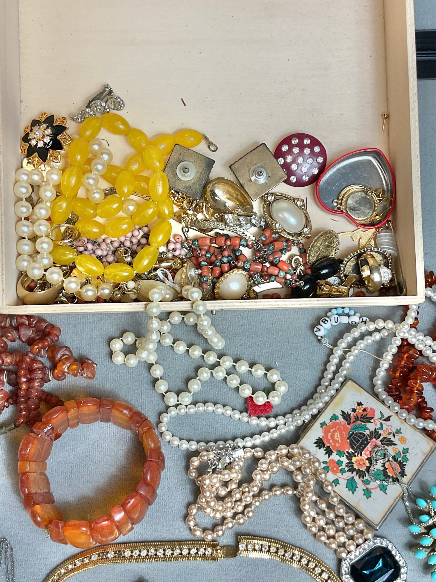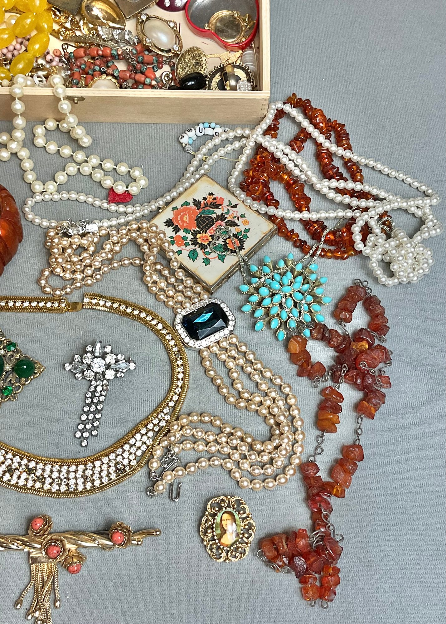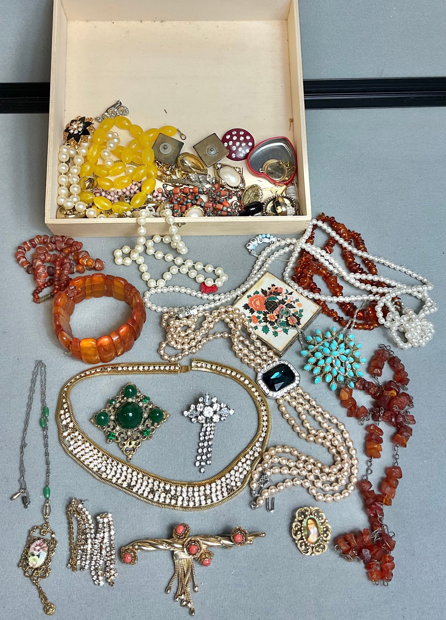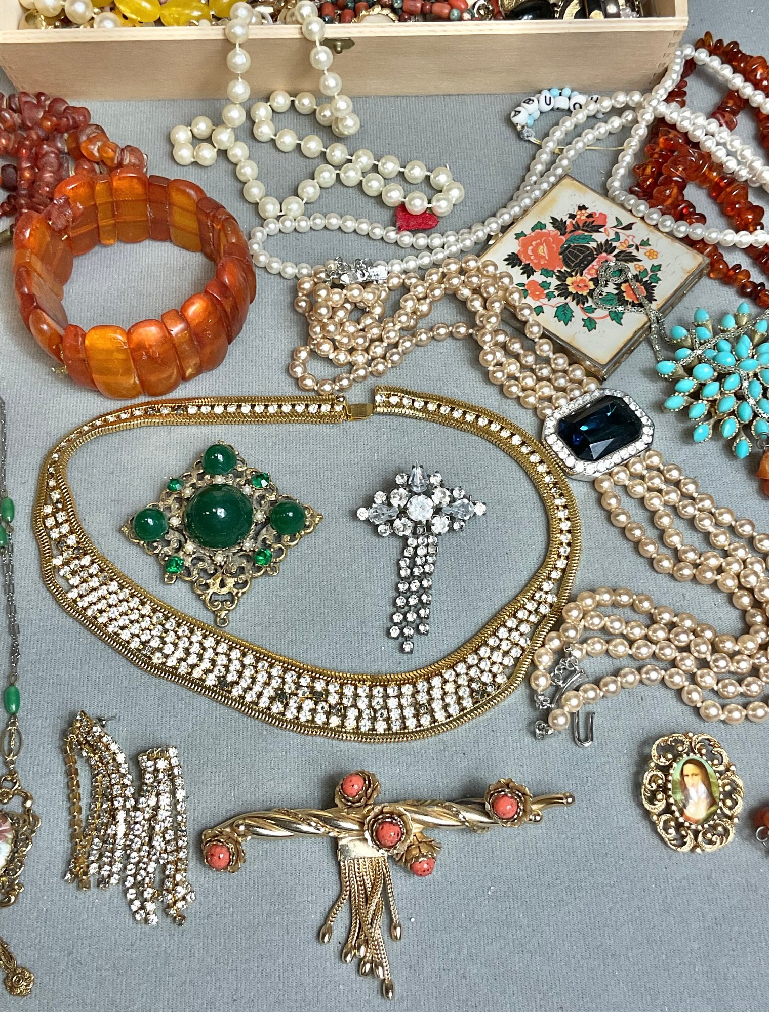 Wood Box Full Vintage Costume Jewelry - as found - amber, rhinestones, sterling cross pendant - good used condition