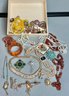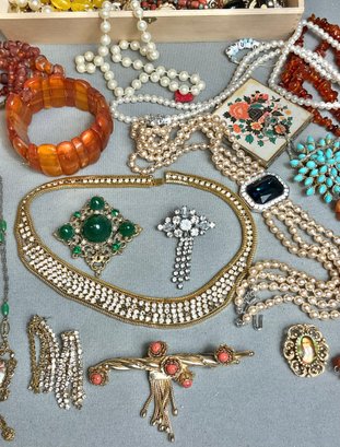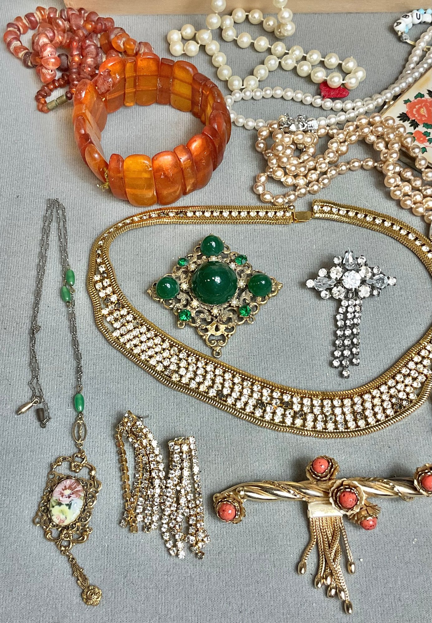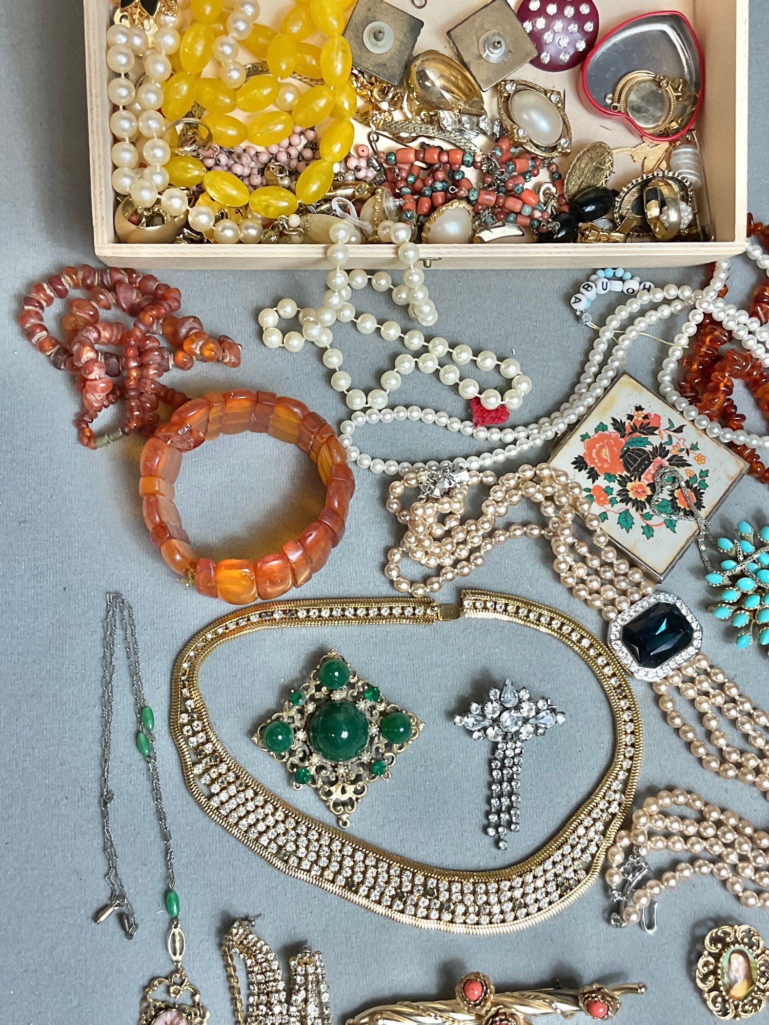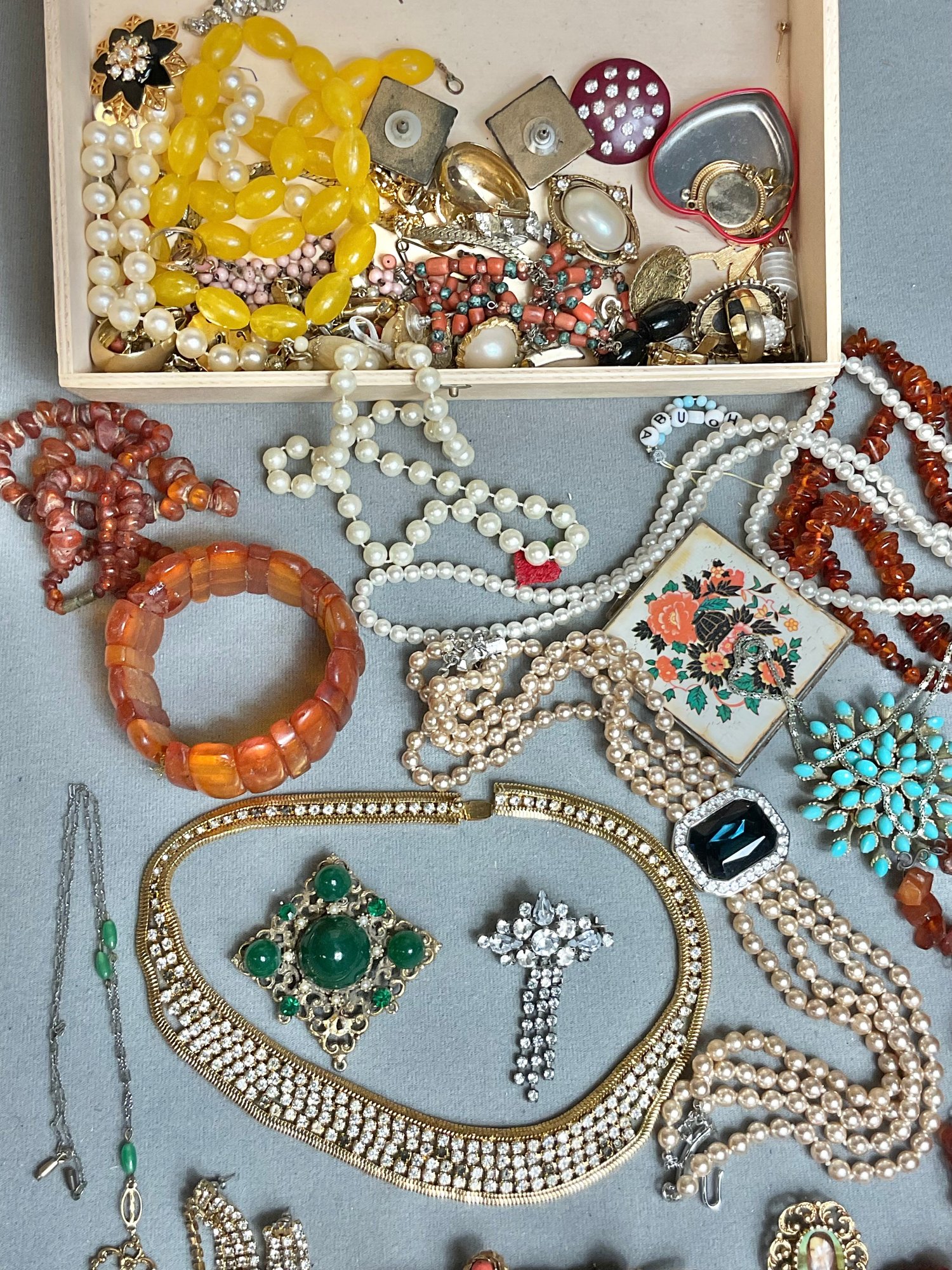 Wood Box Full Vintage Costume Jewelry - as found - amber, rhinestones, sterling cross pendant - good used condition