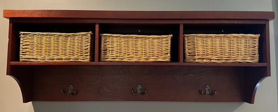 Wooden Wall Shelf/Coat Rack With 3 Baskets - 42'' x 9'' x 15'' - small chip shown - good used condition