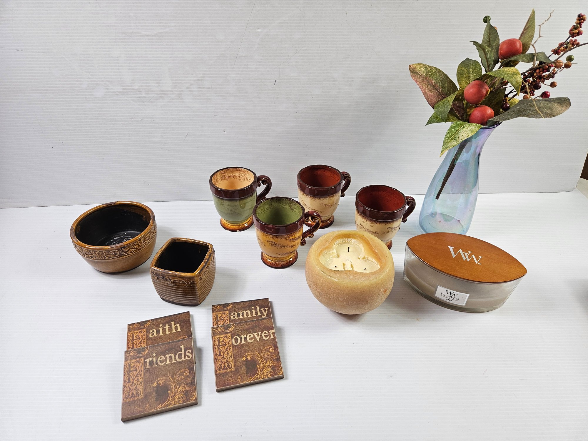 4 Coasters, Two Pottery Bowls That Had Candles, Four Mugs One Has Chips, 2 Used Candles