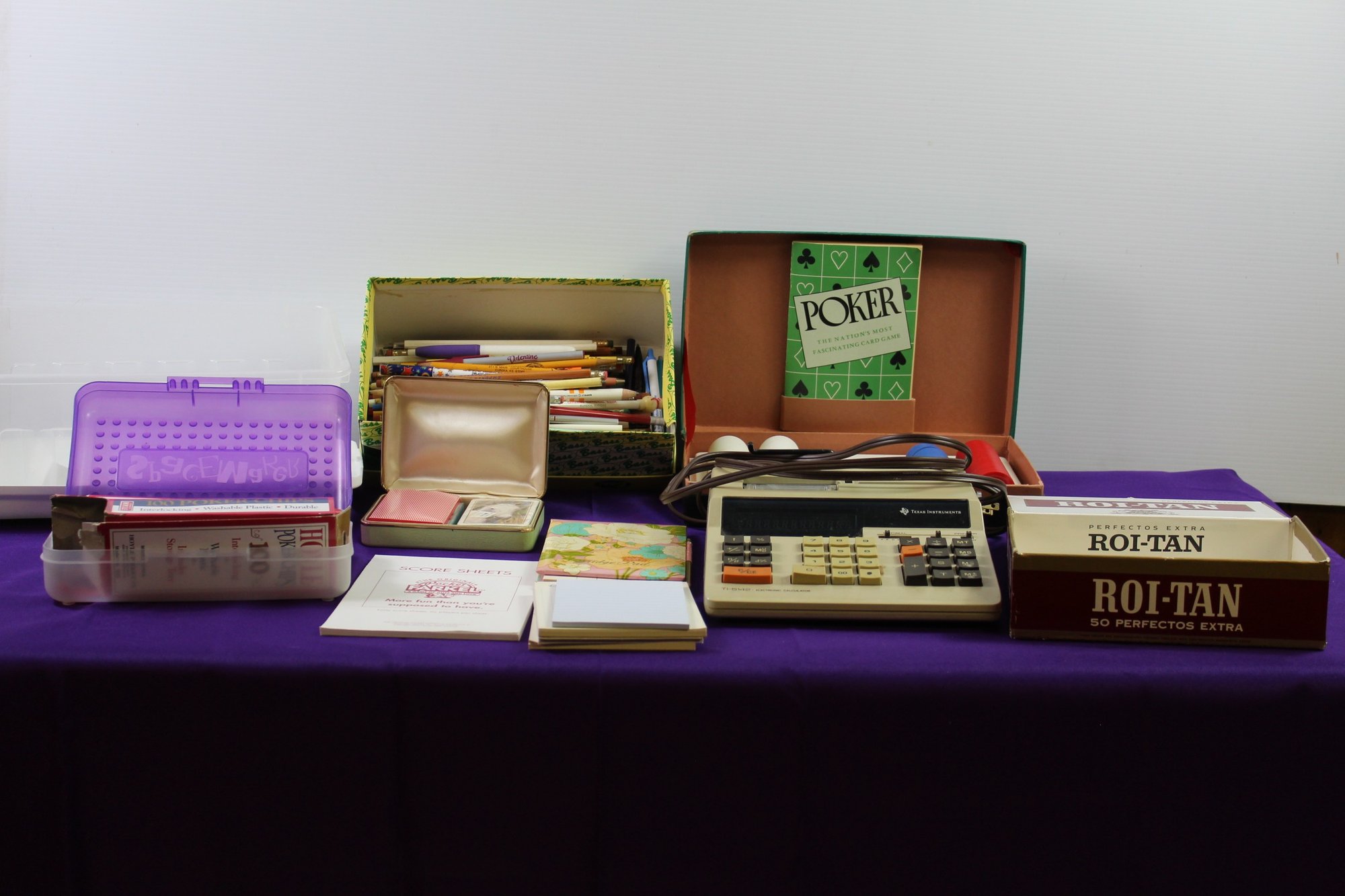 Adding Machine, Poker Chips, Cards, Pens And Pencils