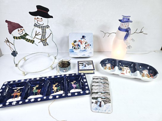 Plastic holder, coasters, divided ceramic dishes one has a small crack, lighted Santa's head is not attached but sits on fine
