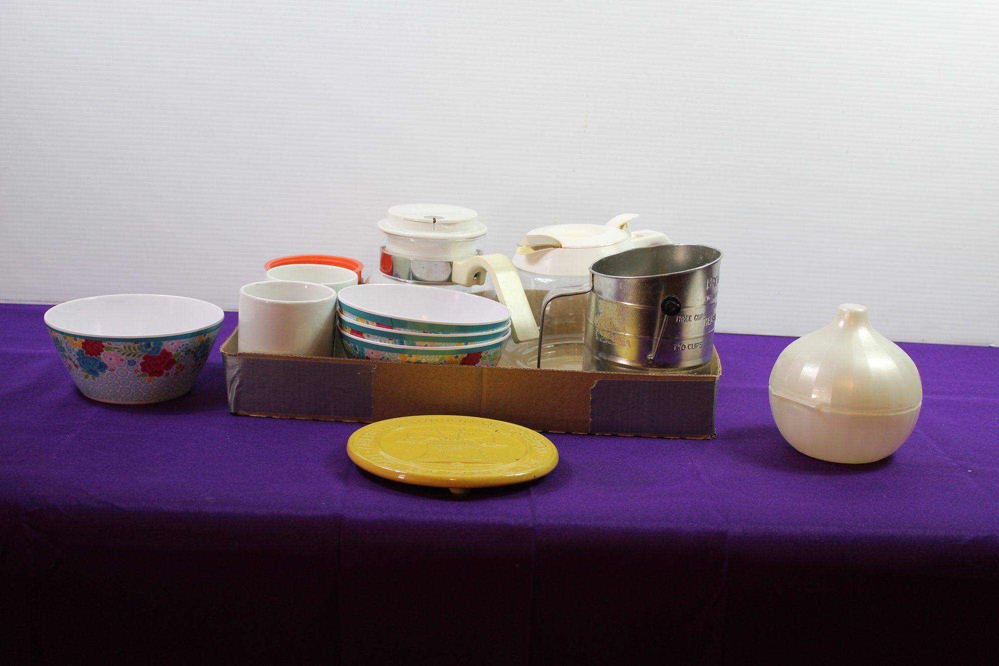 Kitchen Supplies, 2 Coffee Pots, Onion Holder, Sifter, Bowls