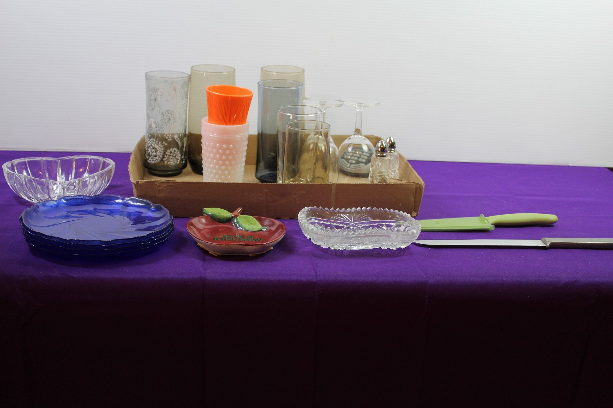Miscellaneous Glasses, Four Blue Salad Plates, Two Candy Dishes, Spoon Rest