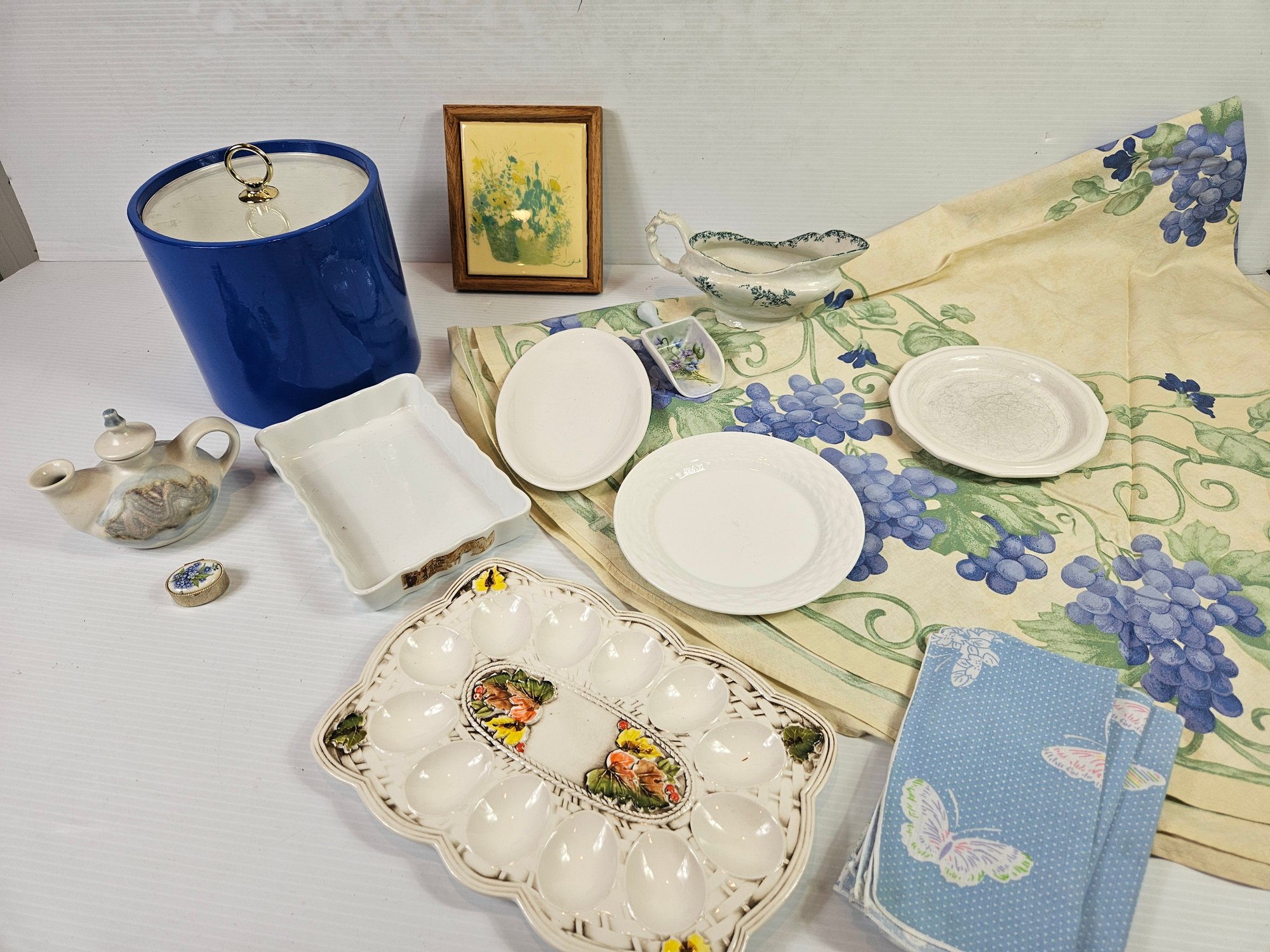 Miscellaneous Kitchen Items, 60 In Round Tablecloth, Four Butterfly Napkins, Ice Bucket, Pill Box Etc