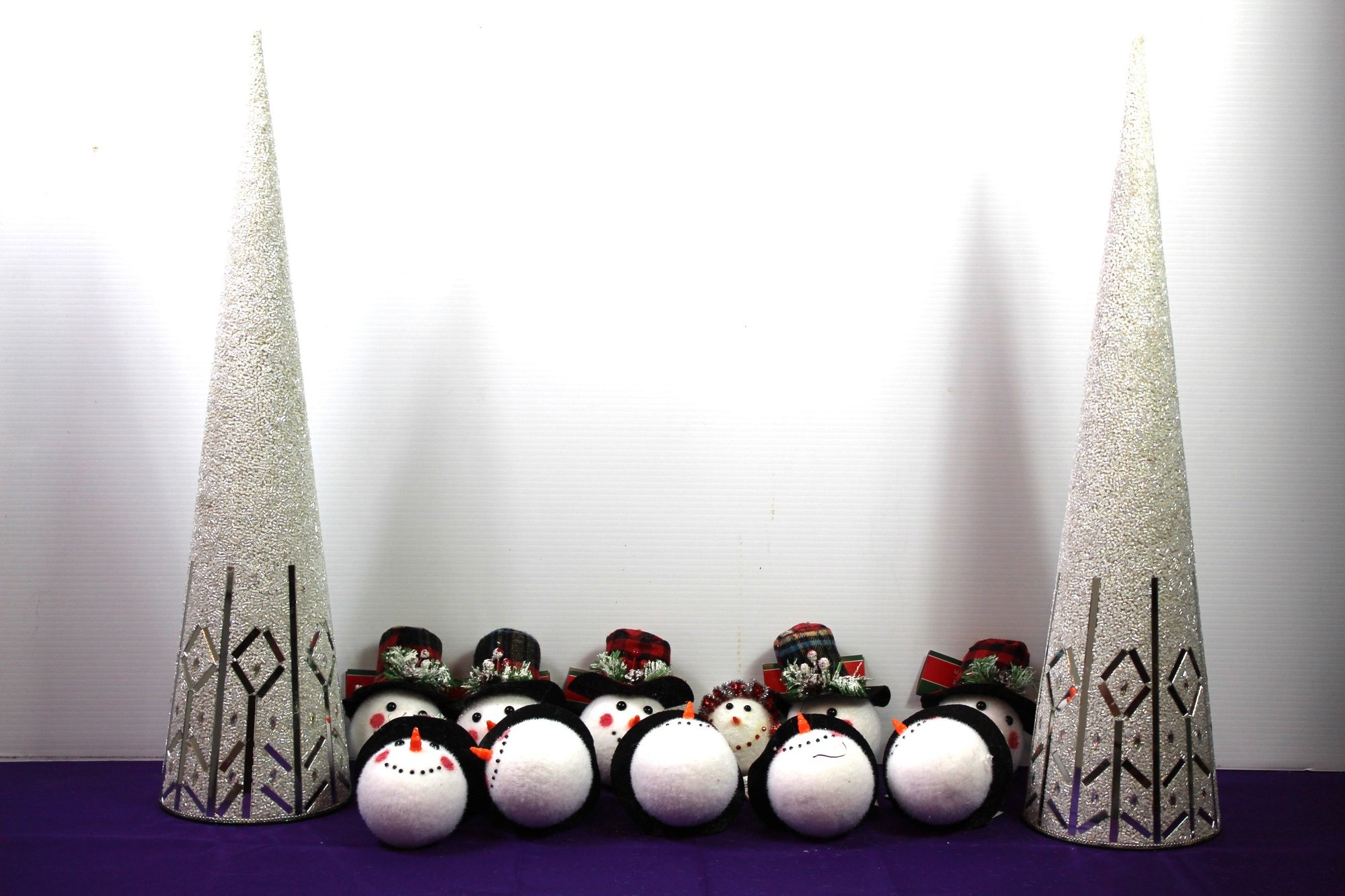 Snowmen Head Ornaments, Two White Trees 24 In Tote With Lid