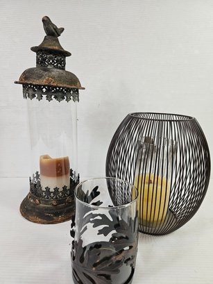 Three Pretty Metal Candle Holders, Smallest Has Crack In Glass