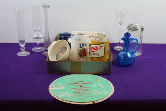 Three Small Vases, Two Beer Glasses, Vintage Cobalt Blue Crackle Cruet With Stopper