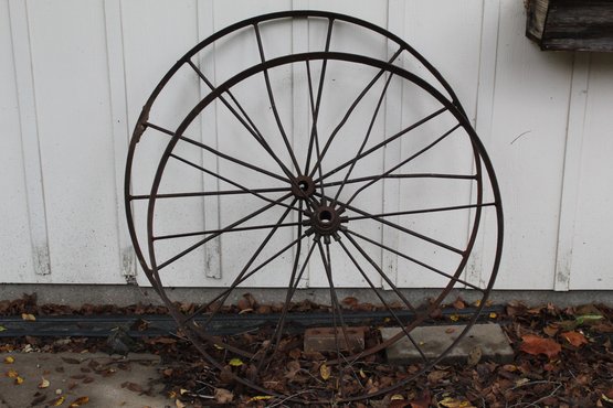 Two Metal Wagon Wheels 41.5 And 44 In Diameter