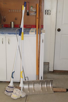 Two Mops, Broom, Snow Shovel