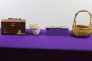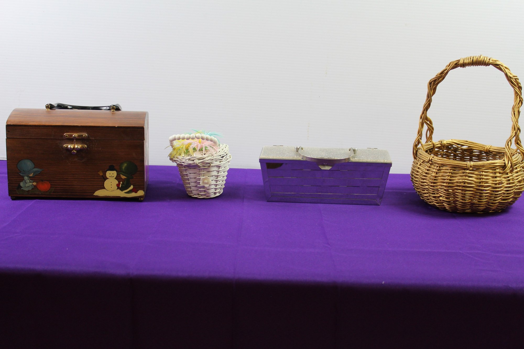 Vintage Wood Trinket Box, Two Small Baskets, Small Metal Box, 1950s Dorset Rex Purse