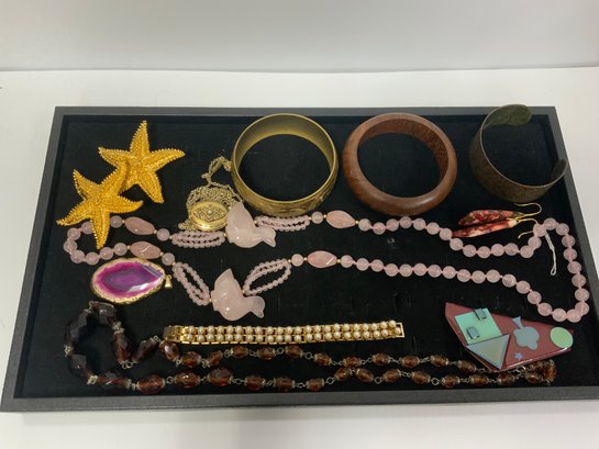 Costume Jewelry Lot With Hardstone or rose quartz Carved Duck Necklace