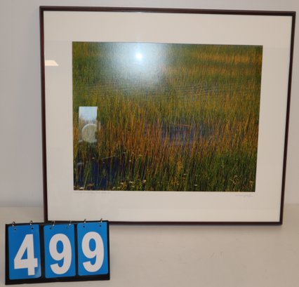 31.5" X 27.5" - Framed Signed Art Work - Unknown Artist - Green And Yellow Grass Blue Water #17