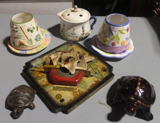 6 ASSORTED MISC ITEMS CANDLE HOLDERS, TURTLE CANDLE PLAQUE ETC