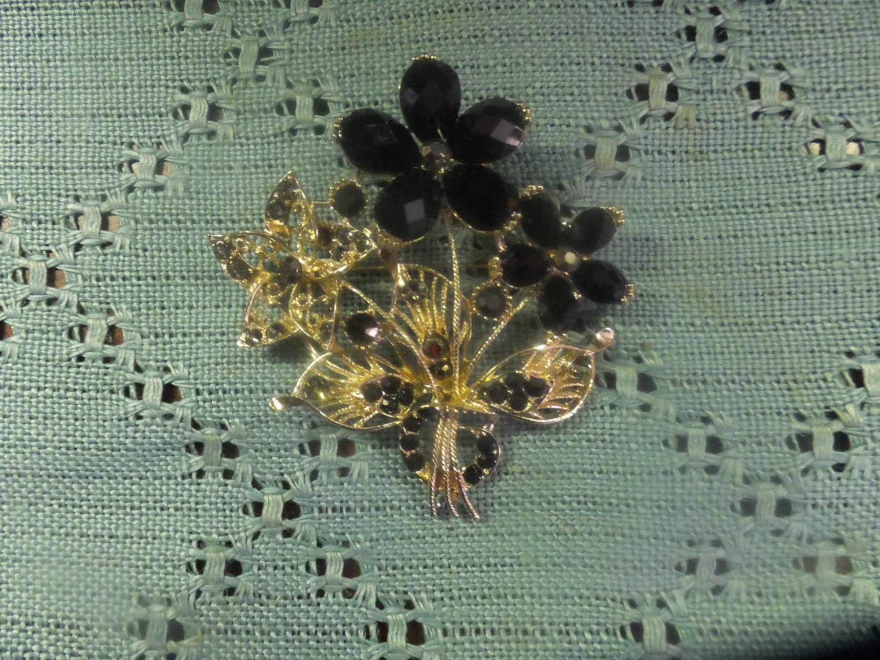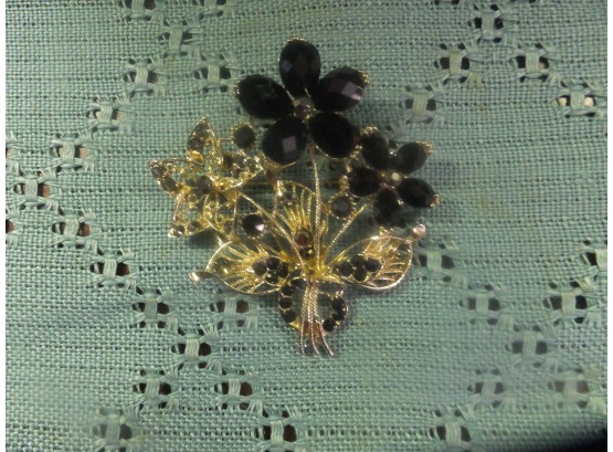 decorative brooch gold tone with black stones measures 3" by 3".