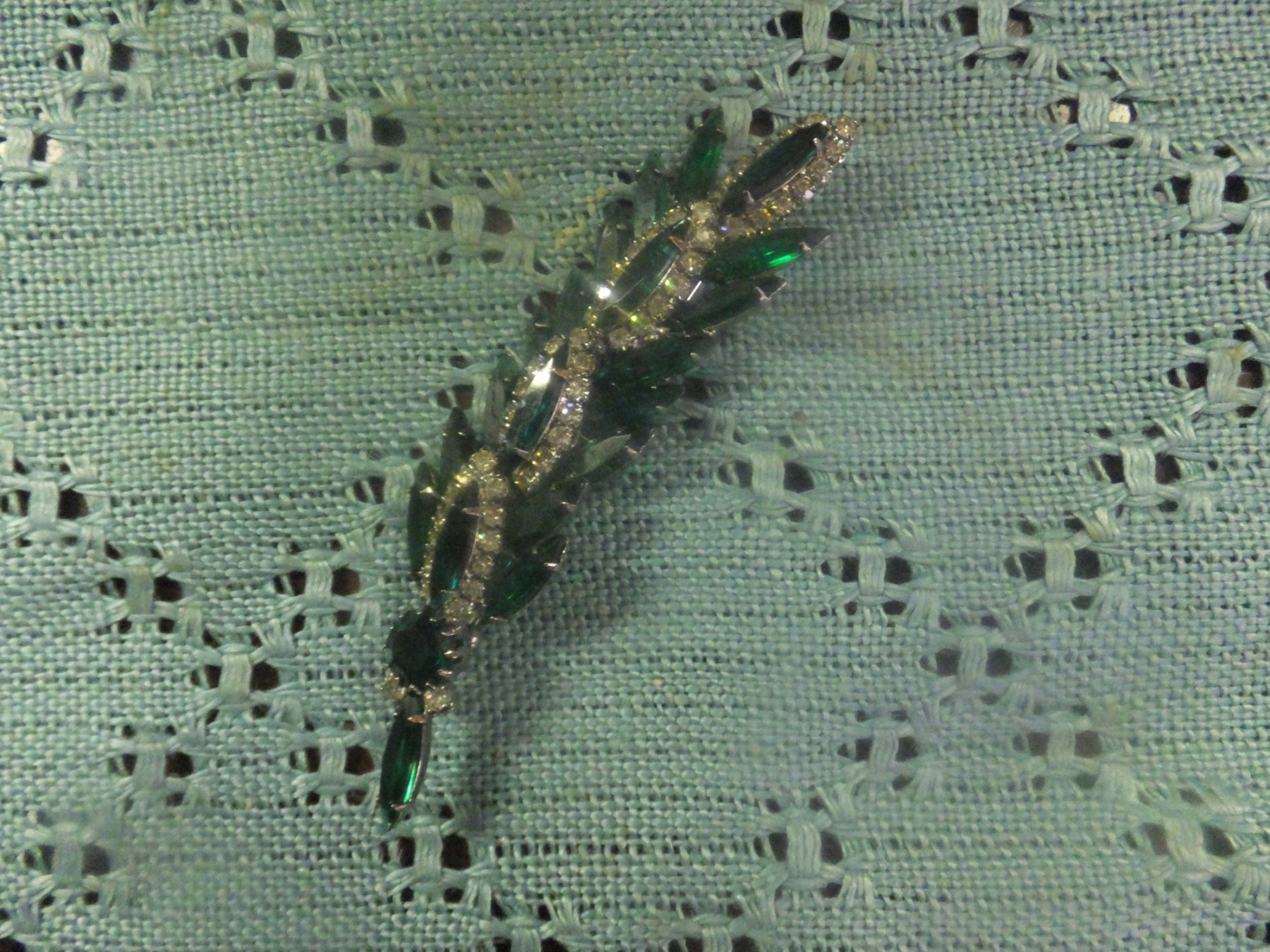 LEAF PIN WITH GREEN STONES AND RHINESTONES MEASURES 3 1/2" LONG