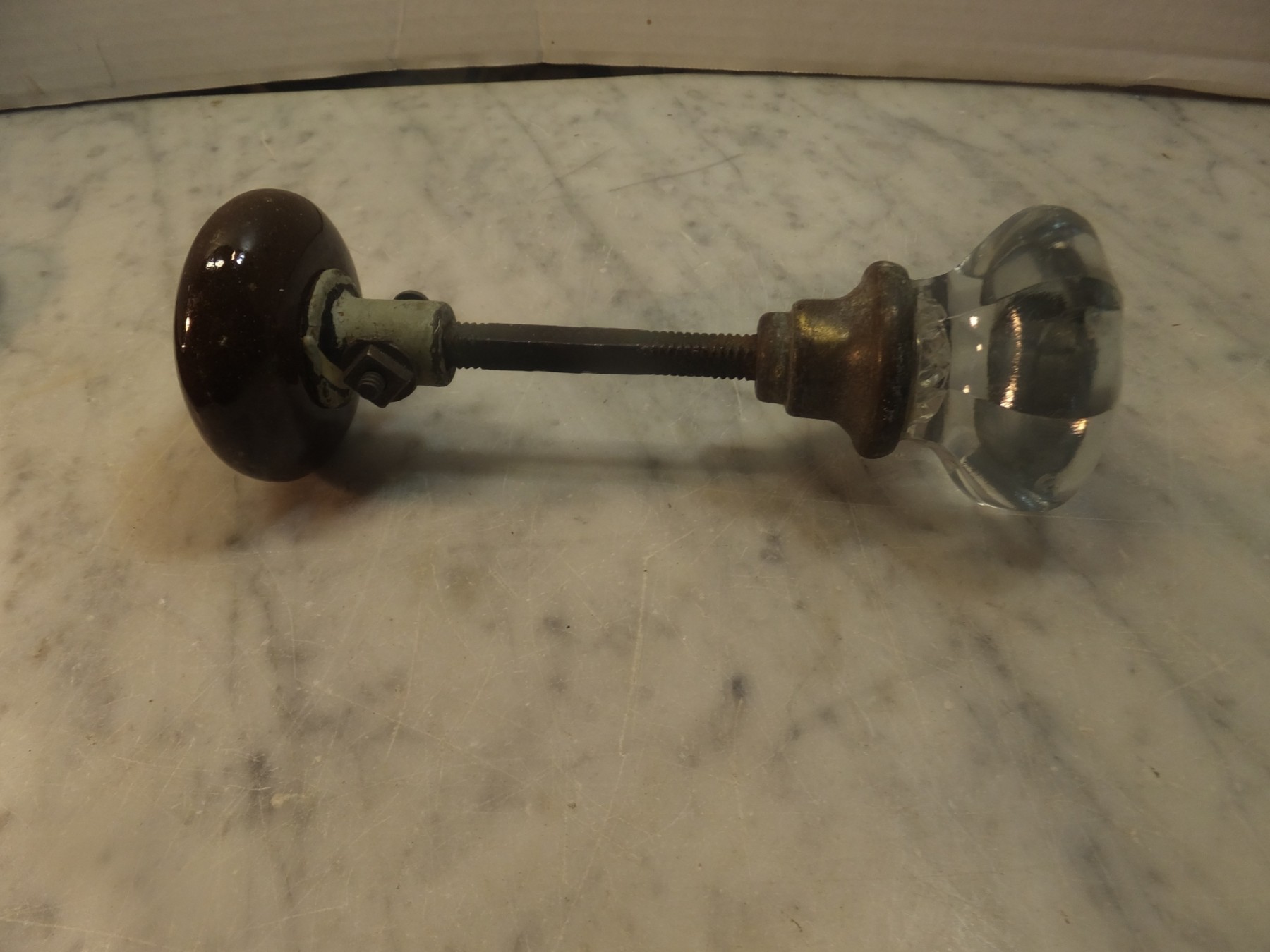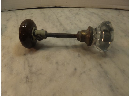VINTAGE DOOR KNOB ONE SIDE CLEAR, OTHER BROWN PORCELAIN MEASURES 6 1/2" COMES WITH HARDWARE.
