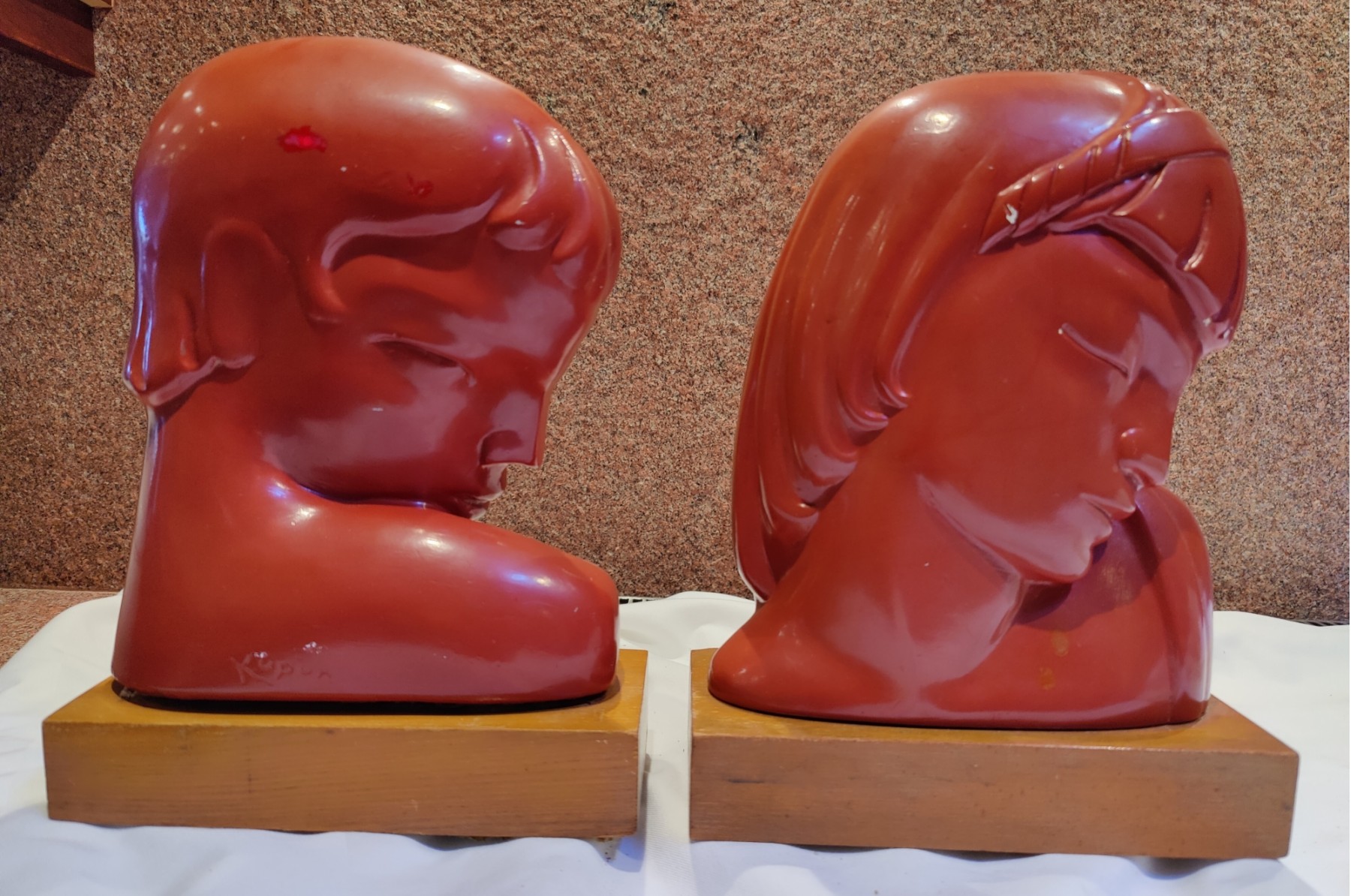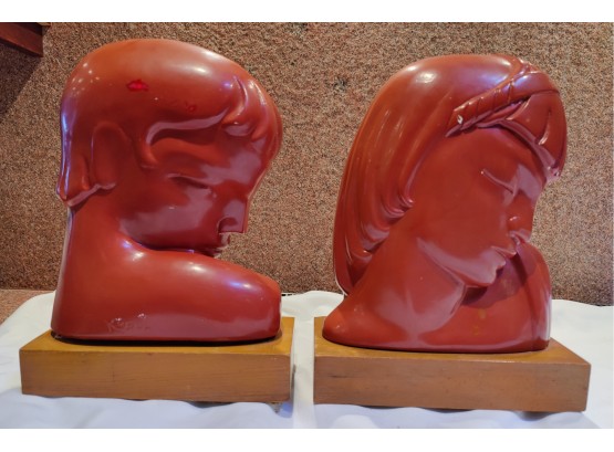 A pair of Art Deco figural busts of a Man and Woman. Features two figural busts composed of composite and mounted to wood bases. Finished in a matte red lacquer and incised signed "Kupur" near base.