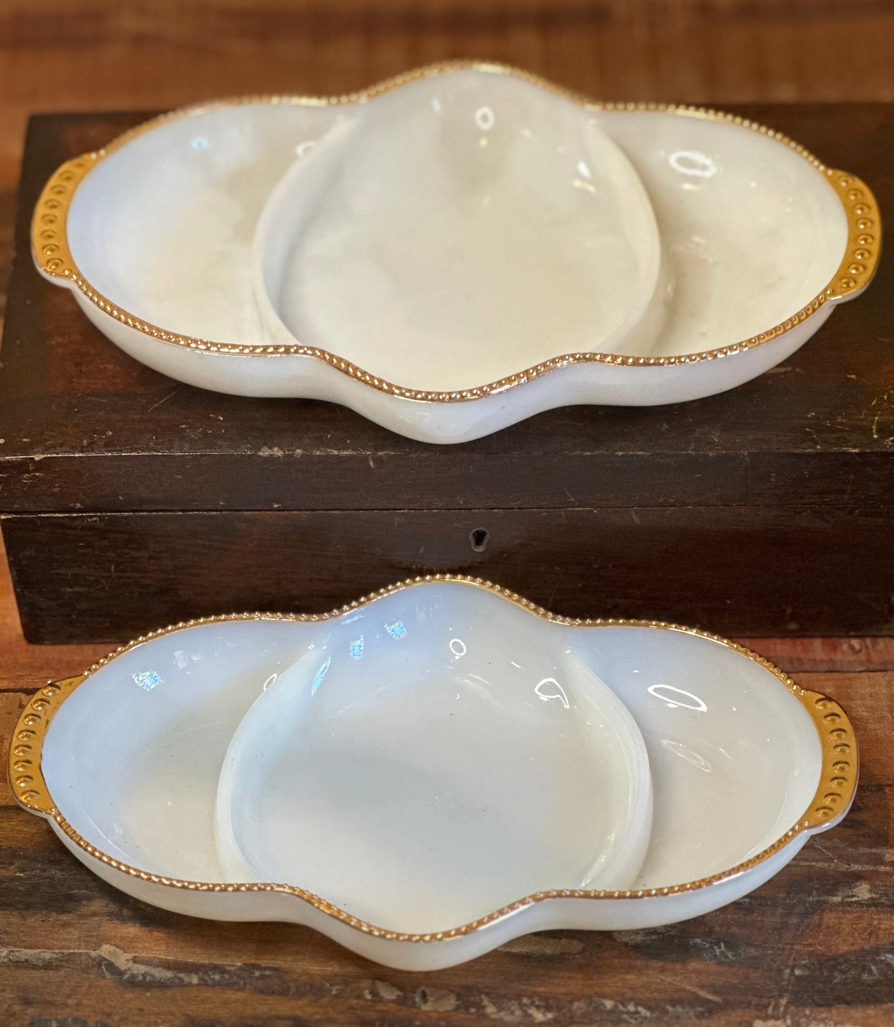 MCM Gold Beaded FIRE KING MilK Glass Serving Divided Snack Trays S/2