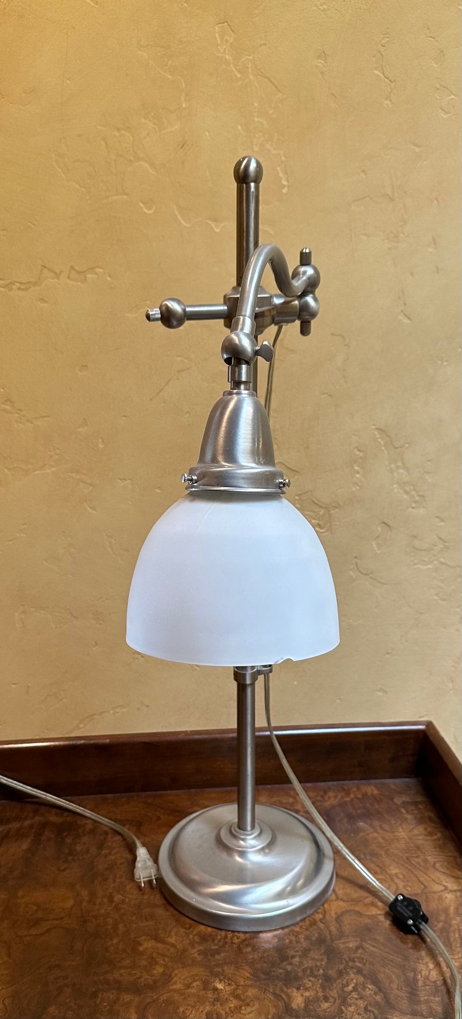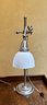 Heavy based, glass frosted shade has a small chip, see pictures for details.