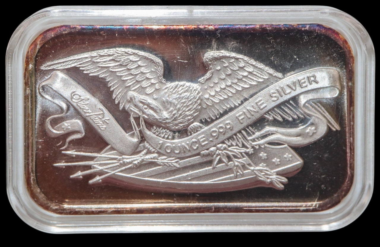1 Ounce .999 Fine silver bar SilverTowne Retro Prospector. Made by the famous Silver Towne Mint in Winchester, Indiana, this silver bar pays tribute to the hardworking pioneers that helped the West succeed.