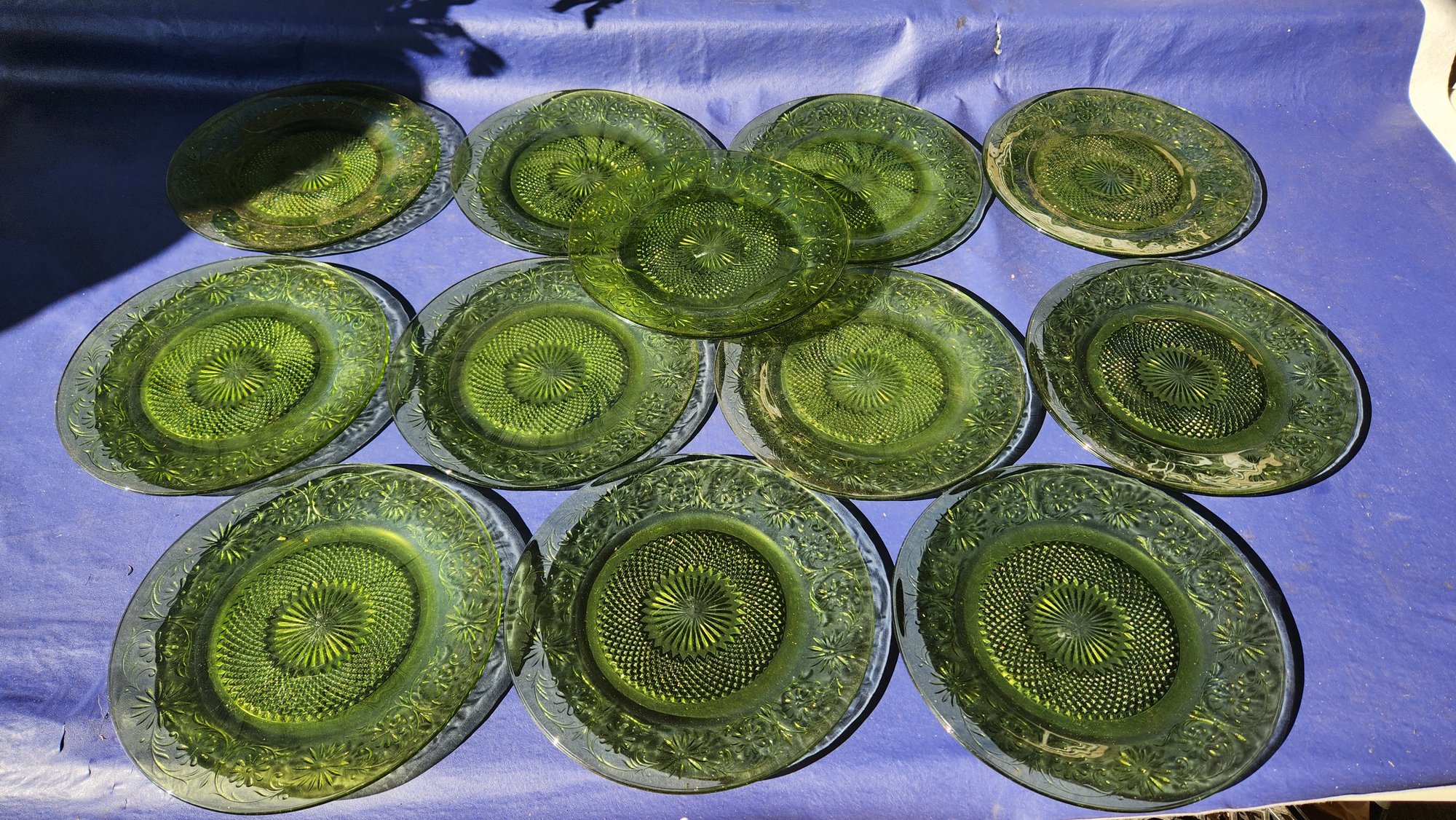12 vintage green glass 10" dinner plates, see photos for better description
