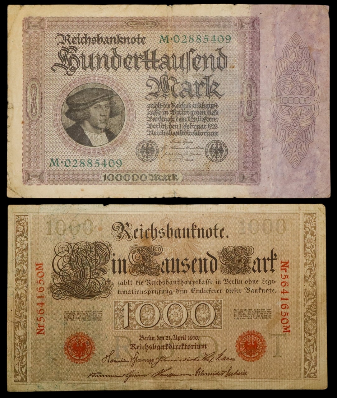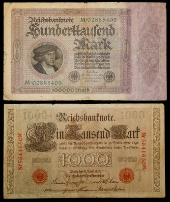 1910-1923 Large Germany Banknotes Inflationary Currency Pair $100,000 & $1,000