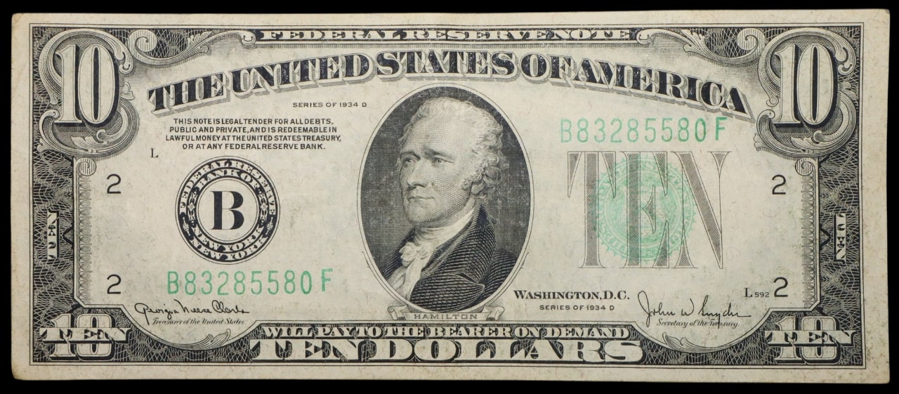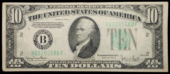 1934-D $10 Federal Reserve Note With Light Green Seal Very Fine
