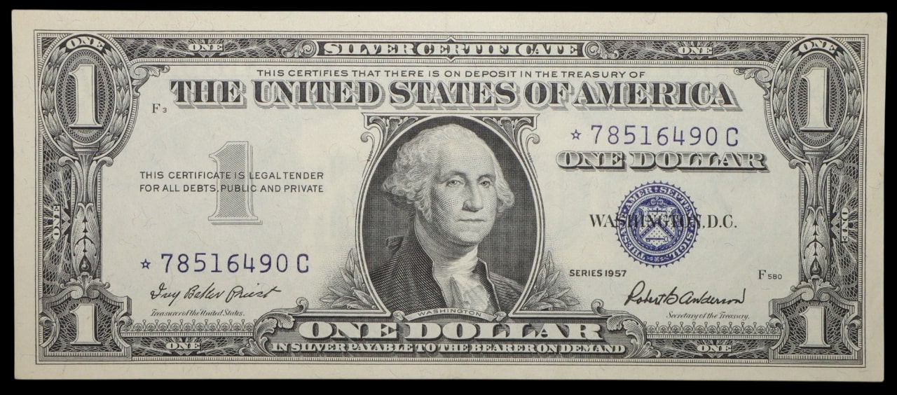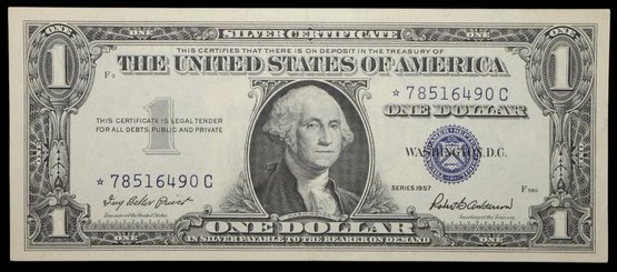 1957 Silver Certificate $1 Star Note with blue seal, about uncirculated .