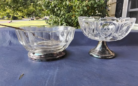 2 vintage glass serving bowls with silver plate base and a vintage silver plate spatula