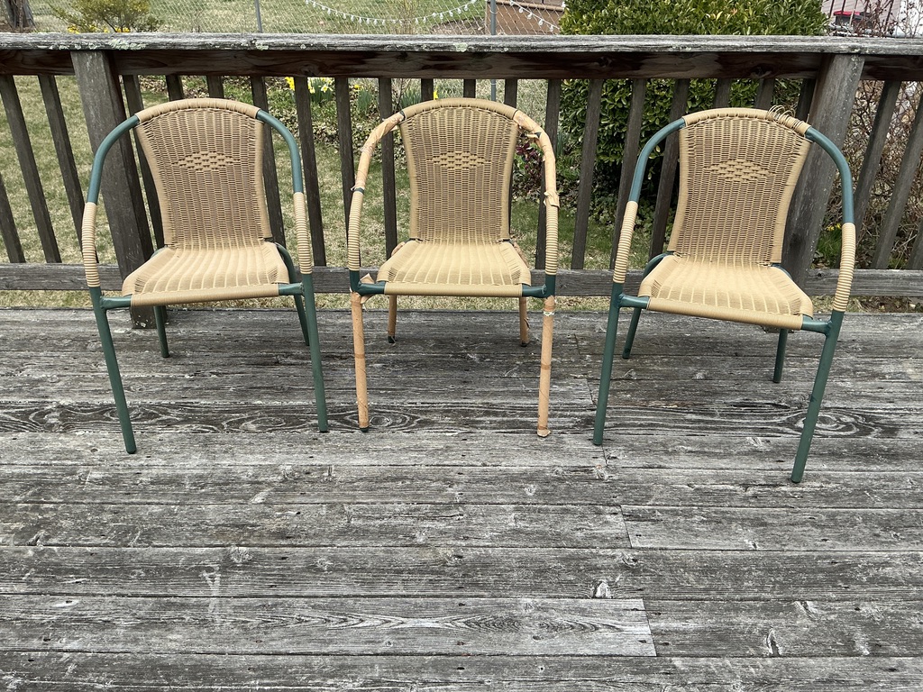 3 outdoor deck chairs, with cushions, with arms, outdoor wicker, 1 is unraveling at the end, but is all there.