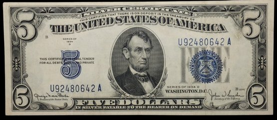 $5 1934-D Silver certificate banknote AU