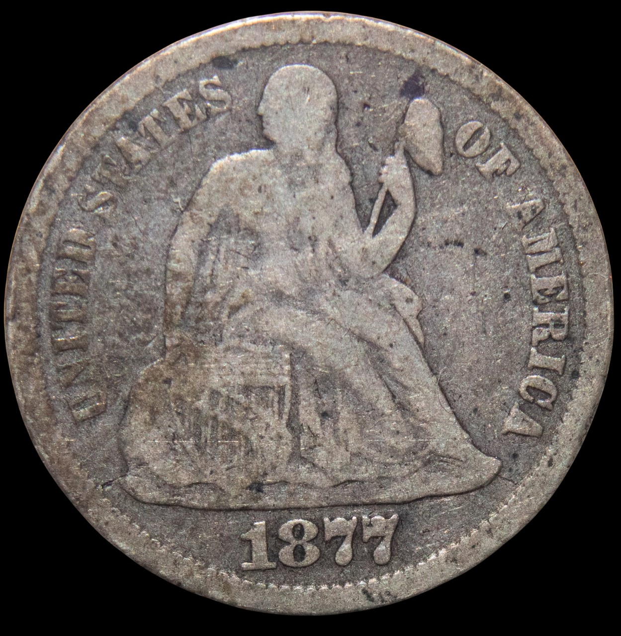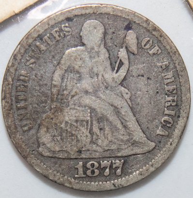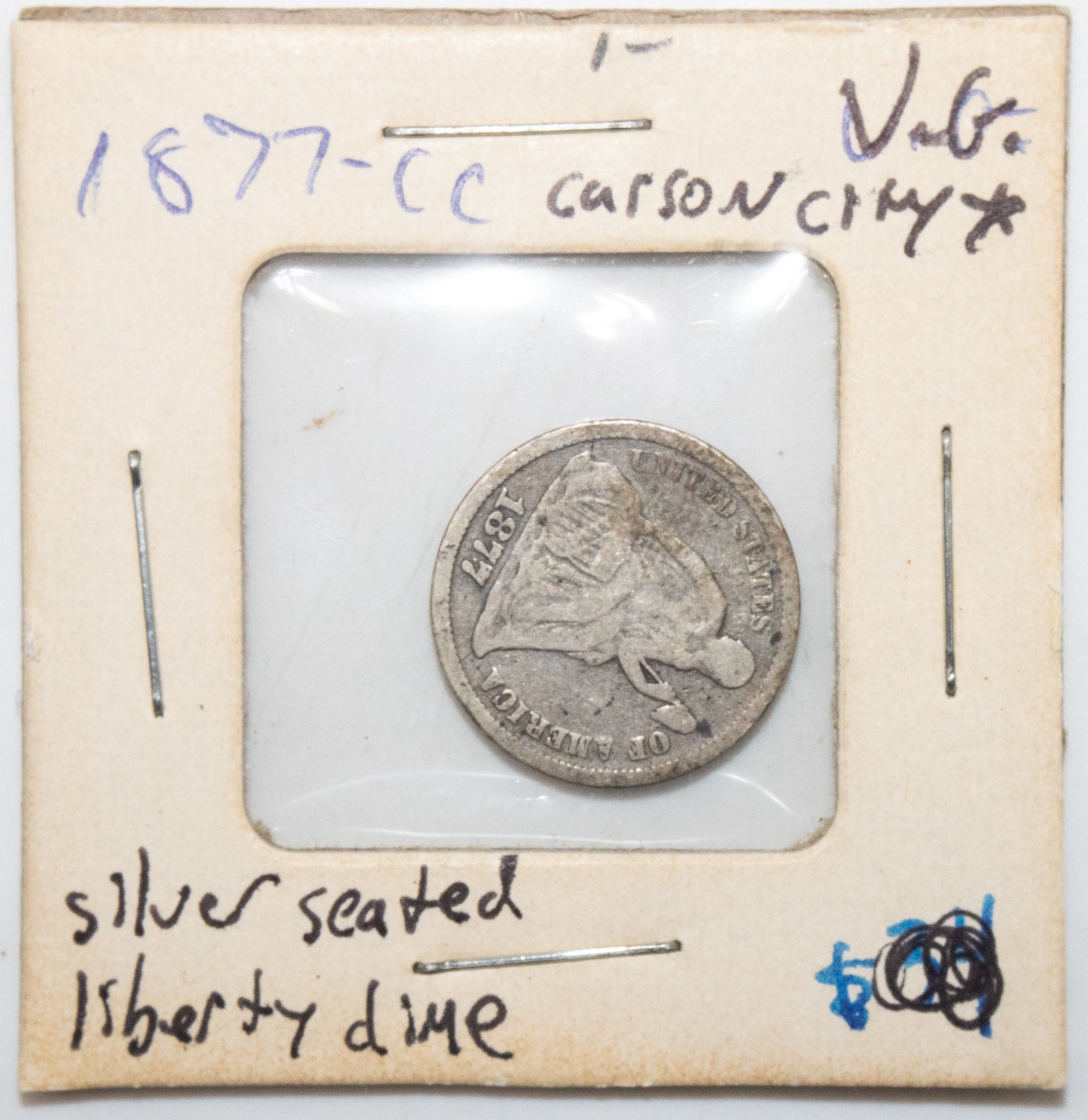 1877-CC Carson City silver Seated Liberty Dime. The Seated Liberty Dime was minted from 1837 to 1891.