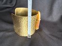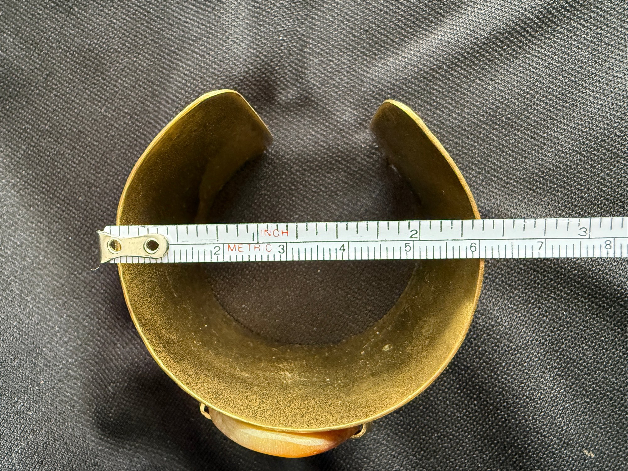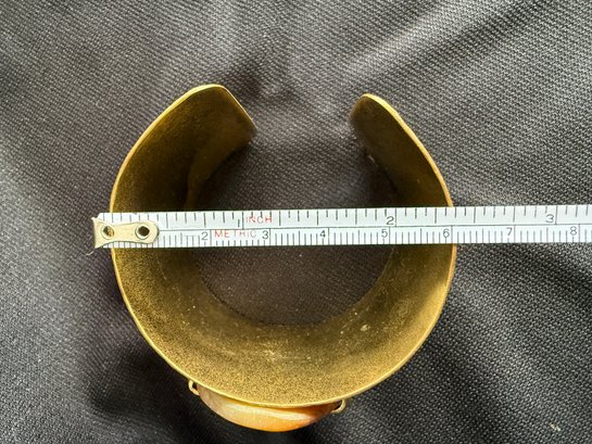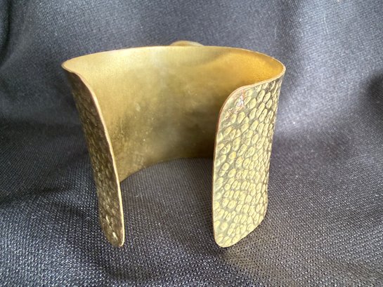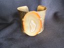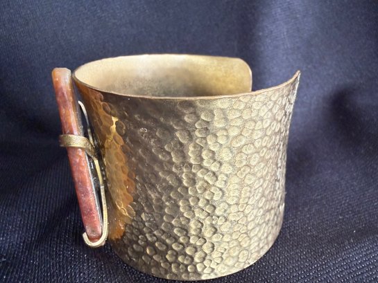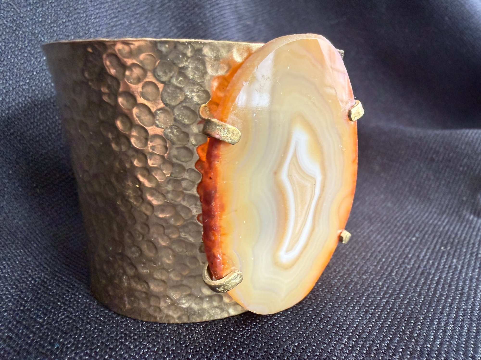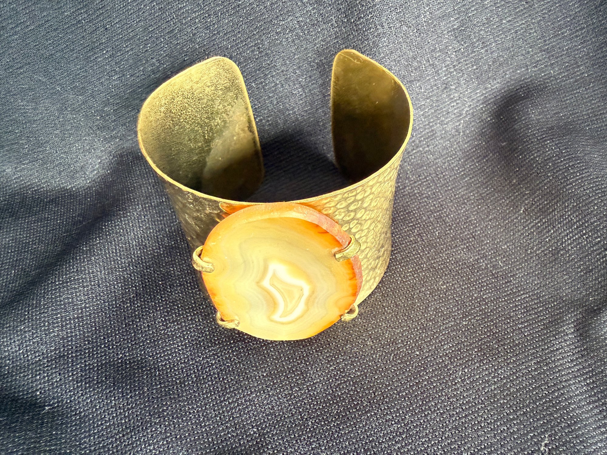 Eye-catching boho style hammered brass cuff bracelet featuring a slab of golden toned agate stone at the center.