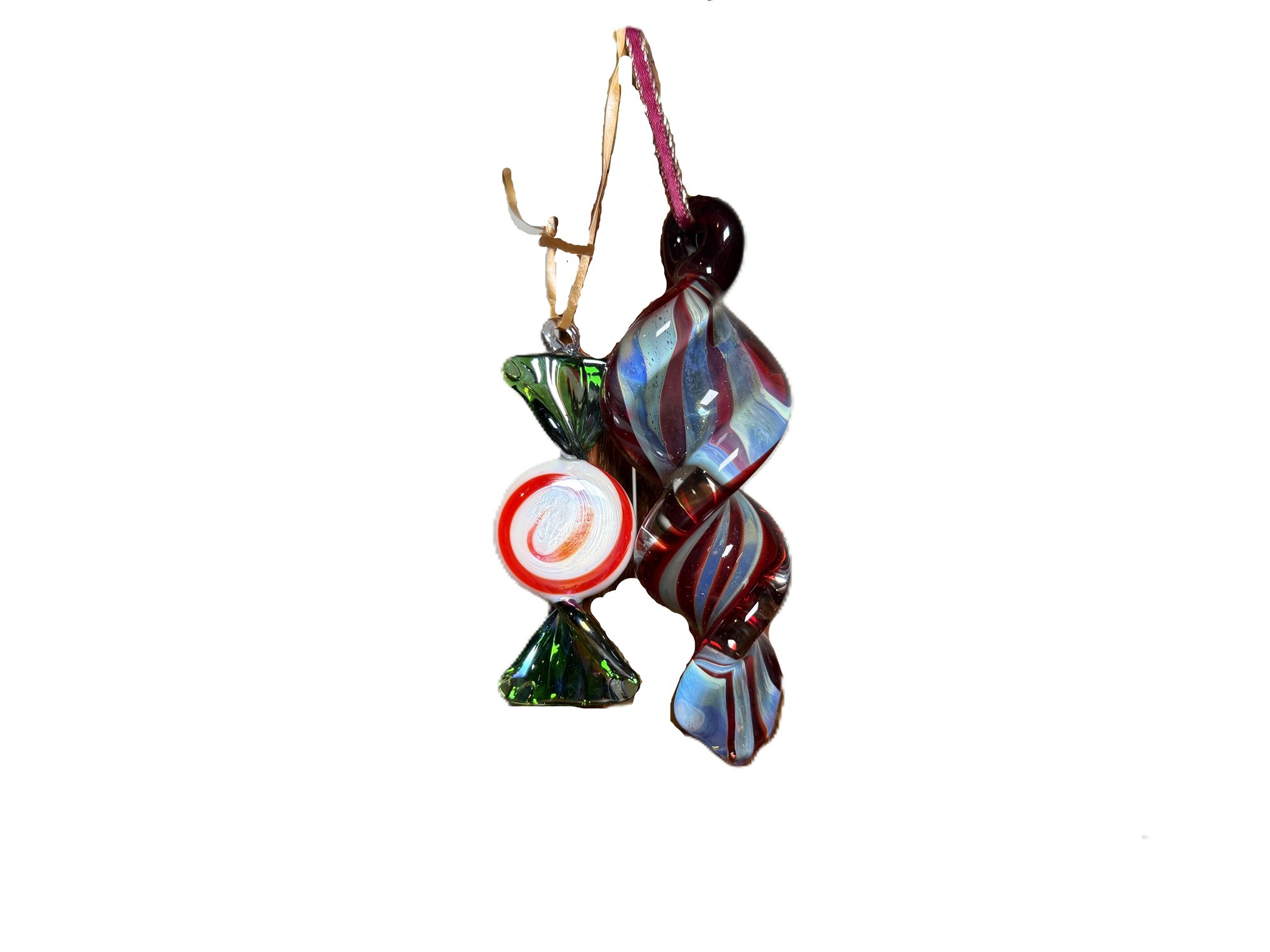 Beautiful pair of art glass ornaments, including one in the form of a peppermint candy and the other in a spiral shape.