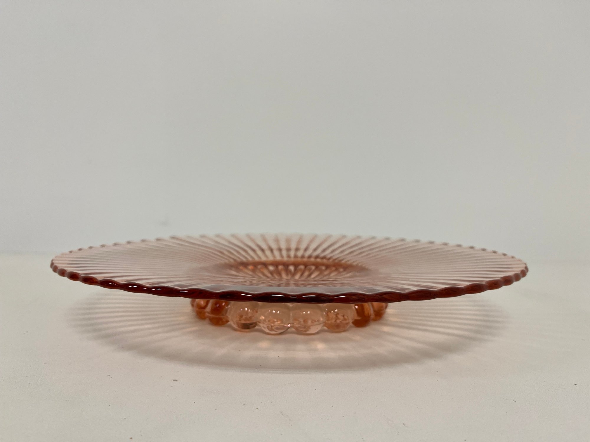 Pretty pink depression glass plate with ball footing. See photos for details and imperfections. Size: 12” diameter