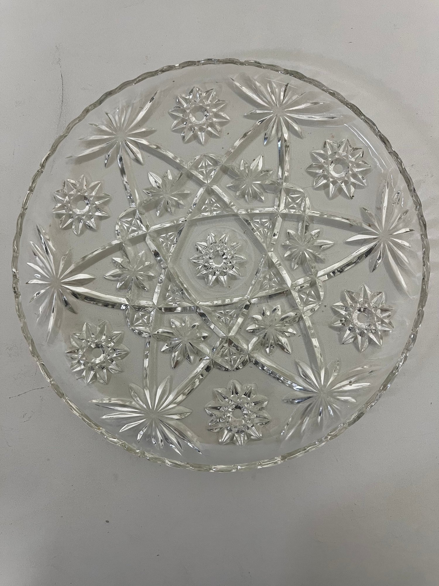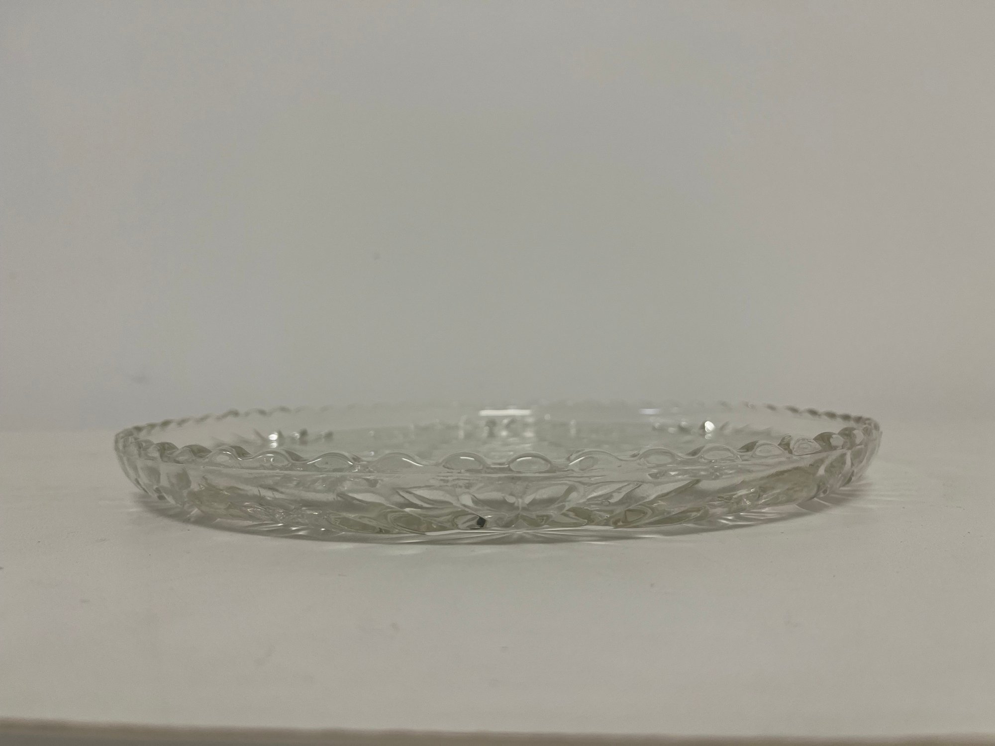Anchor hocking cut glass serving plate. See photos for details and imperfections. Little black mark on back. Size: 11” diameter.
