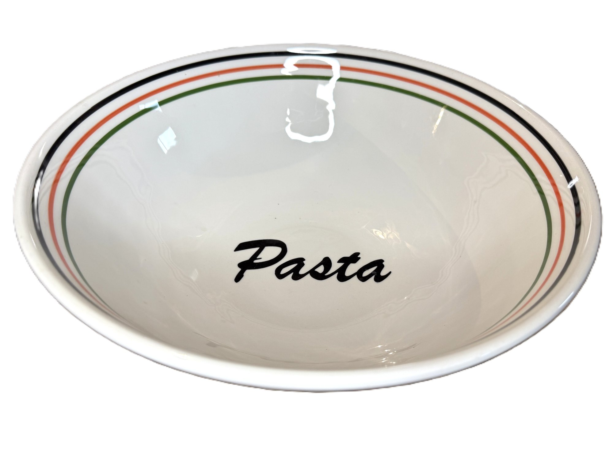 Beautiful traditional Italian handcrafted giant ceramic pasta bowl by Roma Inc. with a modern black, orange and green stripe around the edge and graphic black cursive "Pasta" at the bottom of the dish.