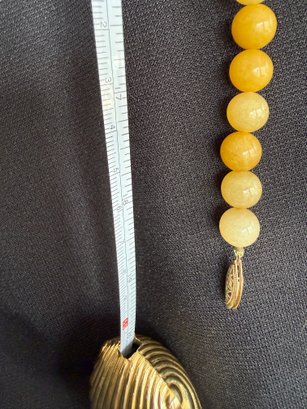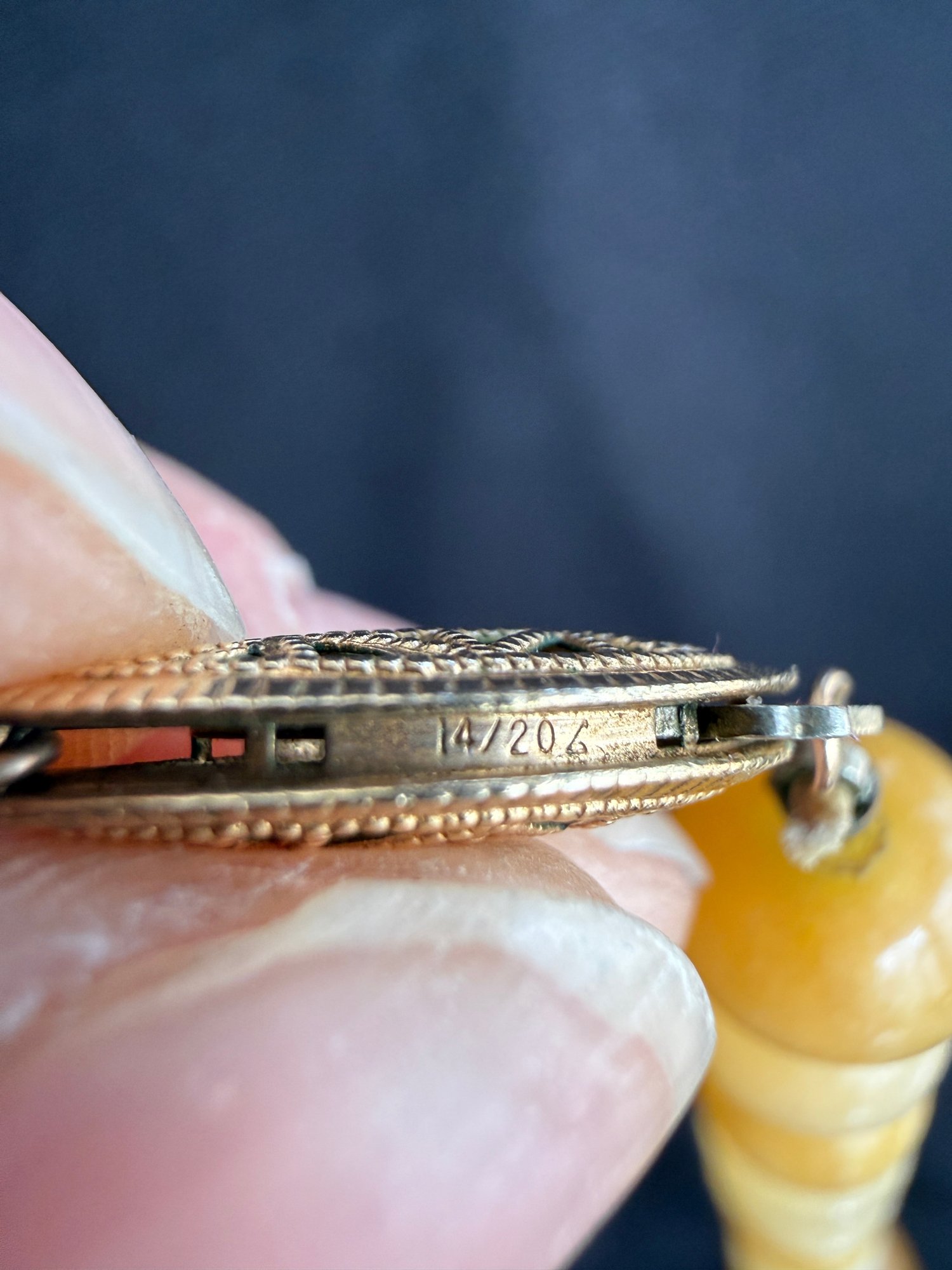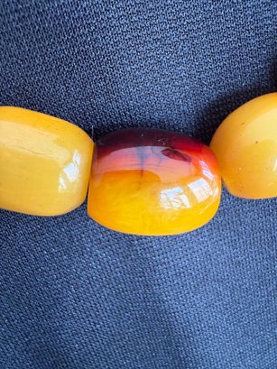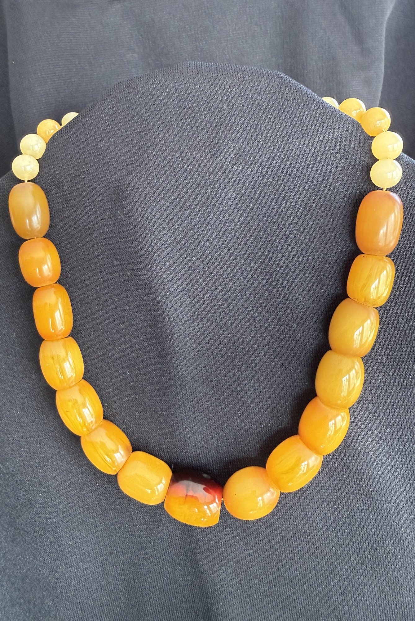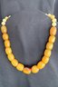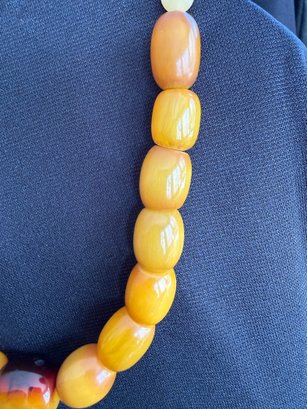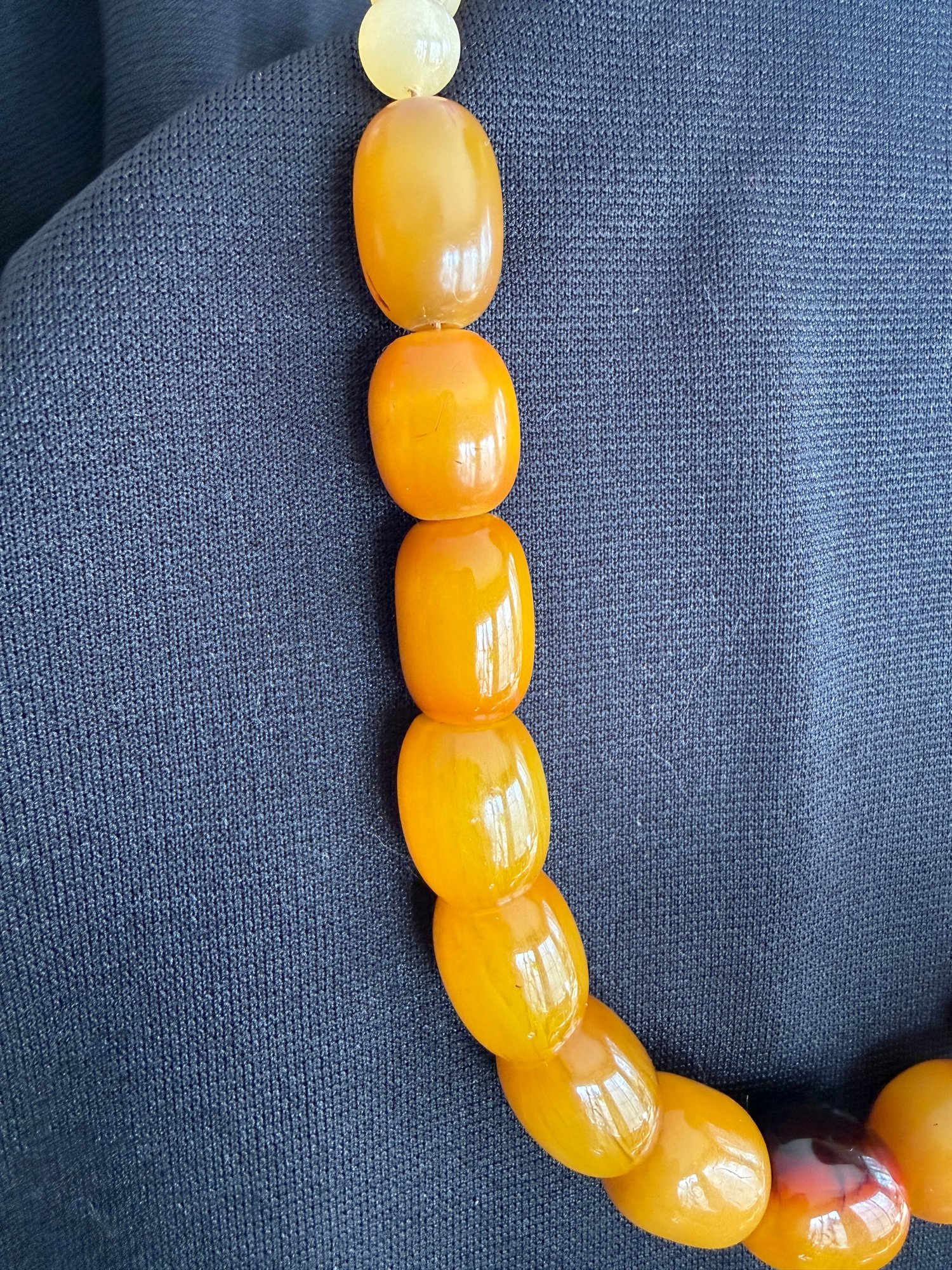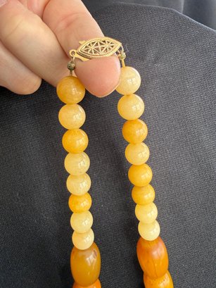 Antique necklace with larger oblong shaped amber or perhaps Bakelite beads with smaller round honey-tone quartz beads towards the gold-filled filigree clasp. Measures about 20" when opened, end to end.