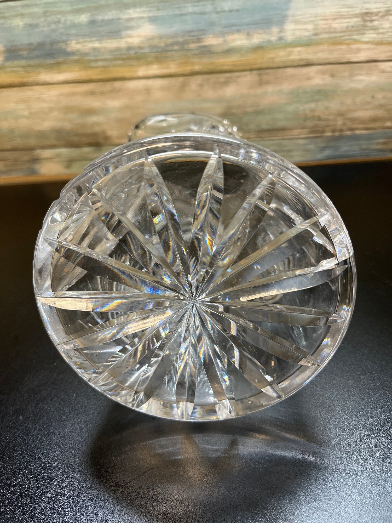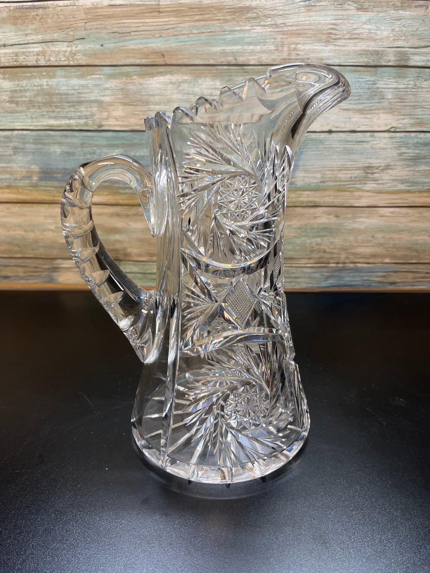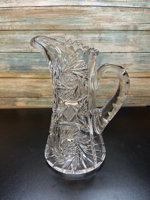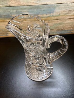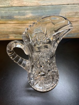See photos for details. Measure 6 1/2 inches wide with handle by 10 inches high.