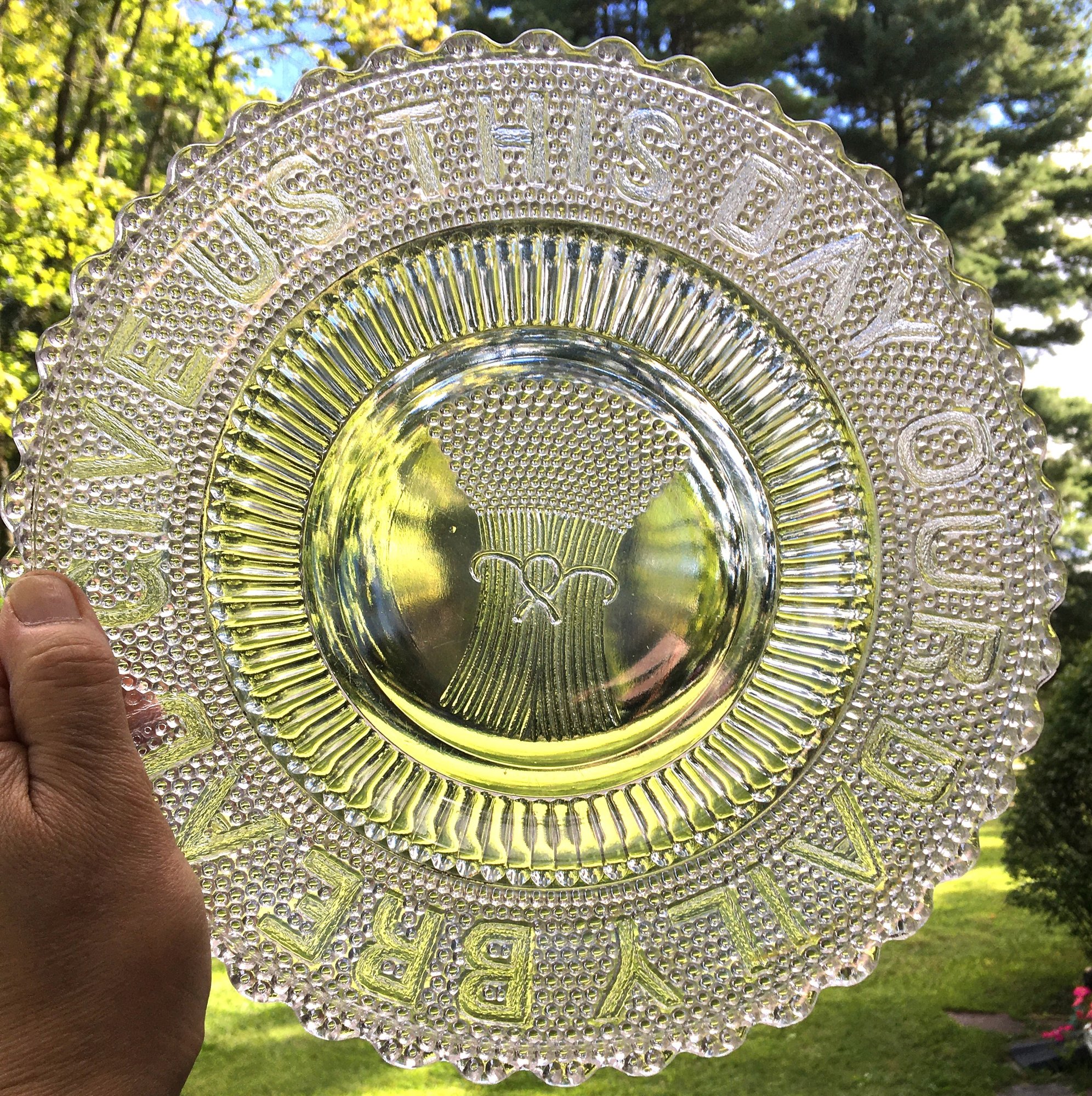 Antique EAPG Adams Co. Depression Glass Bread Cake Dish with Fancy "Give Us This Day Our Daily Bread" Wheat Pattern. - Item was Estate found, Excellent condition with no chips, cracks or damage. Only displayed in case for many years. - Nice to use or it Would make a great Wedding or Christmas gift! - See photos for overall condition.