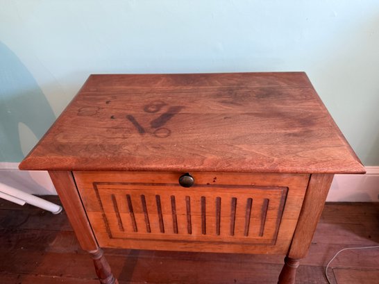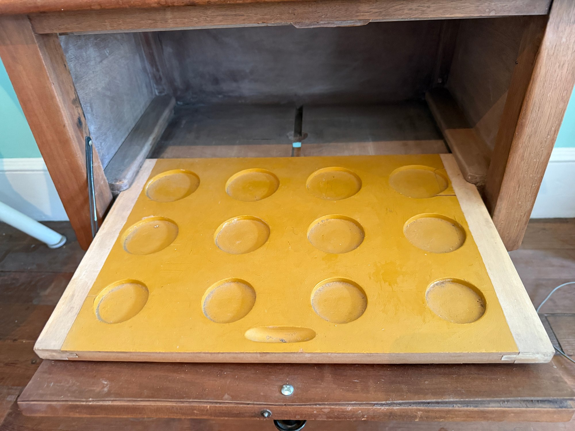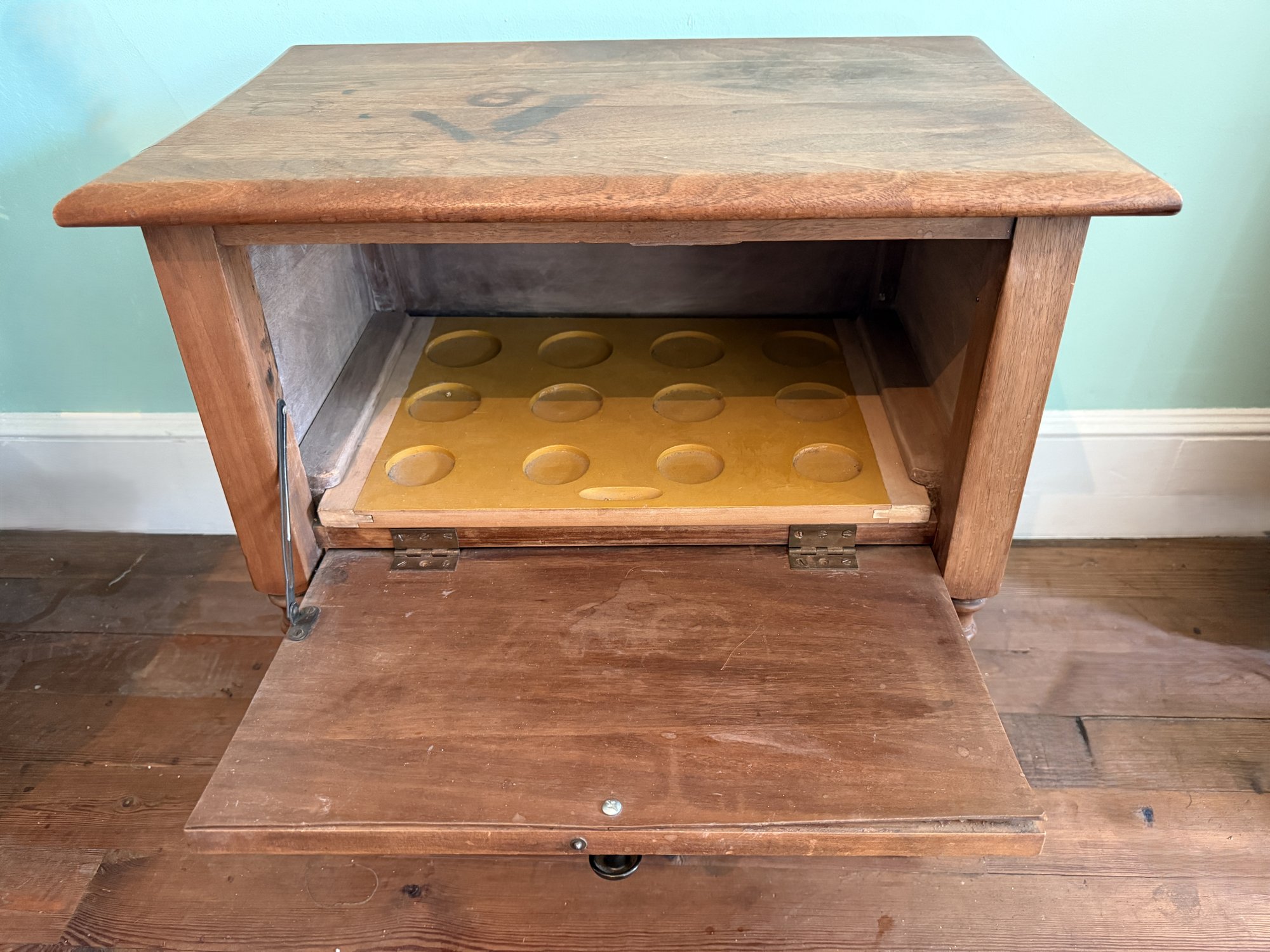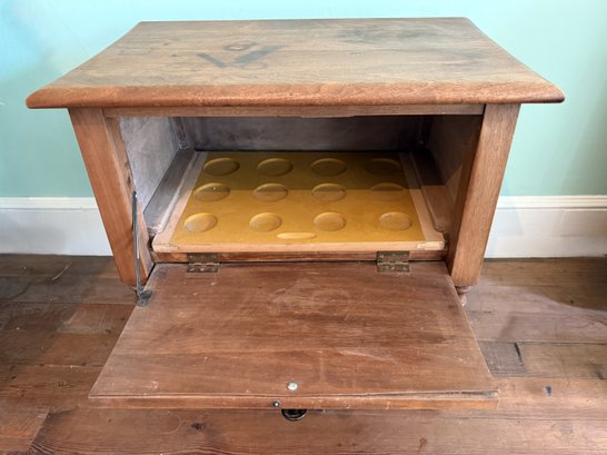 Specialized cabinet from the 1920s perhaps with an interior sliding tray with circular impressions for storing phonograph cylinders.